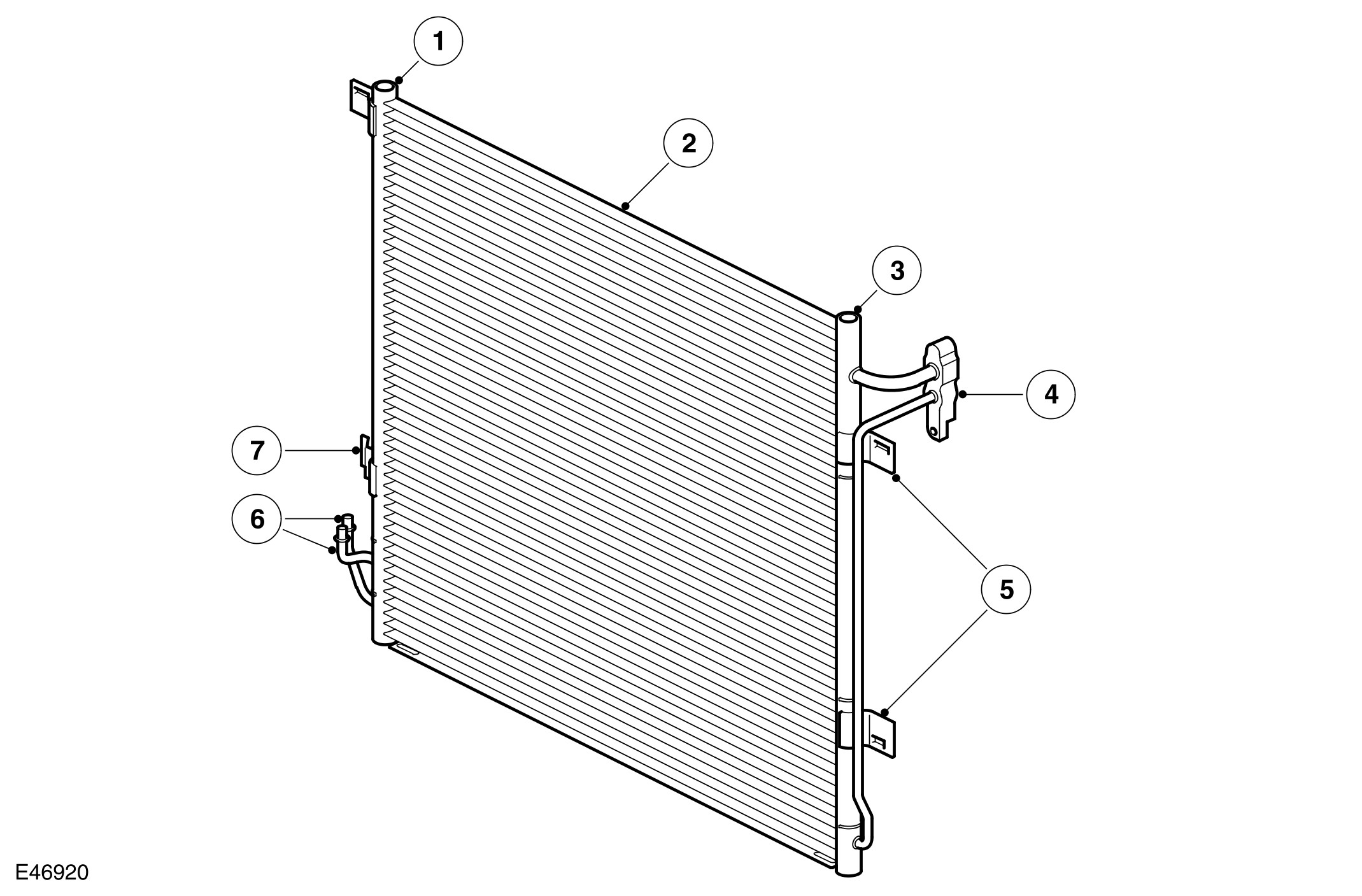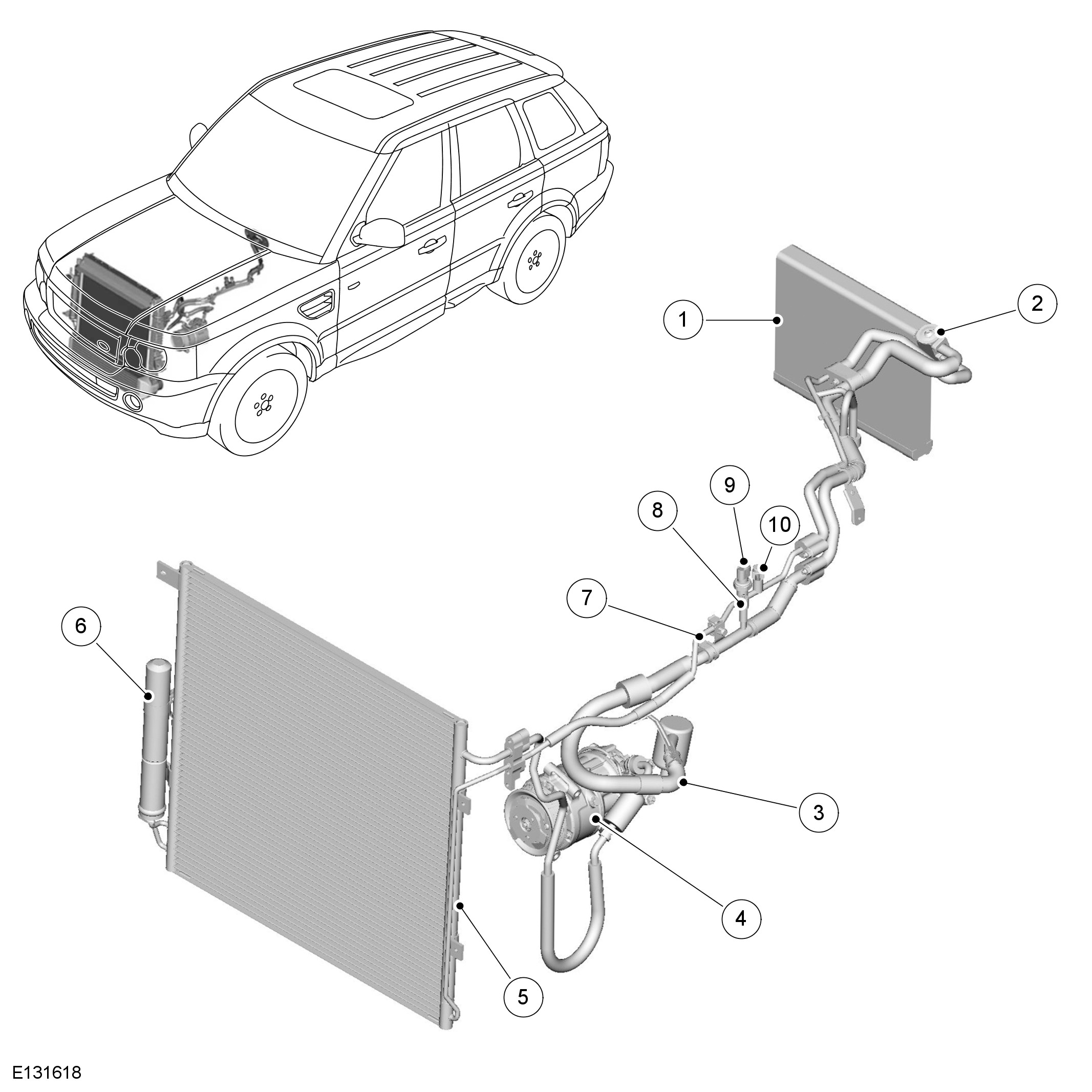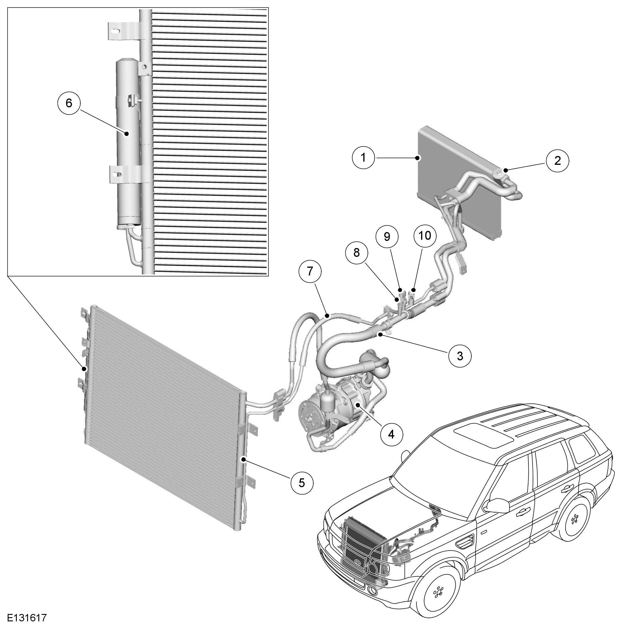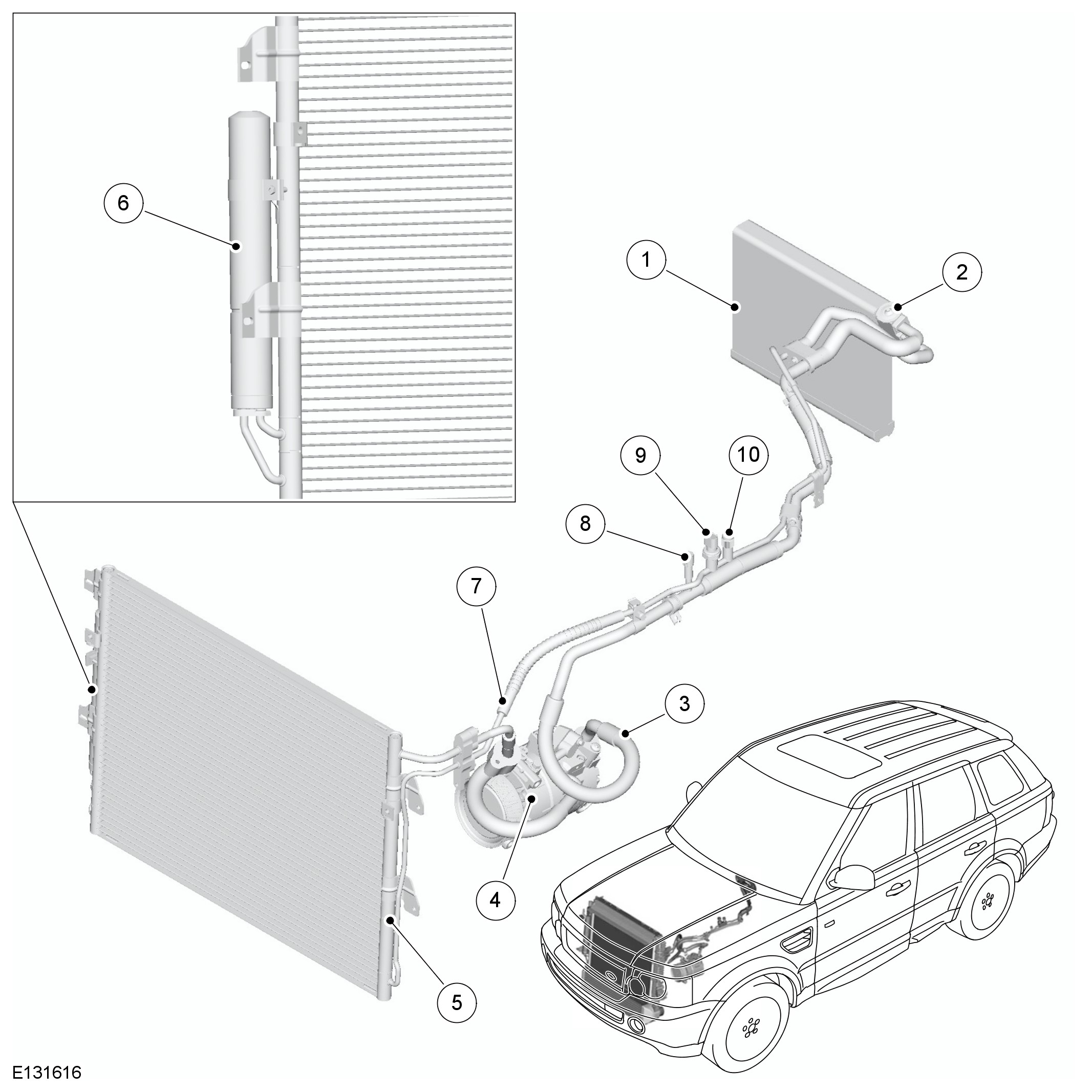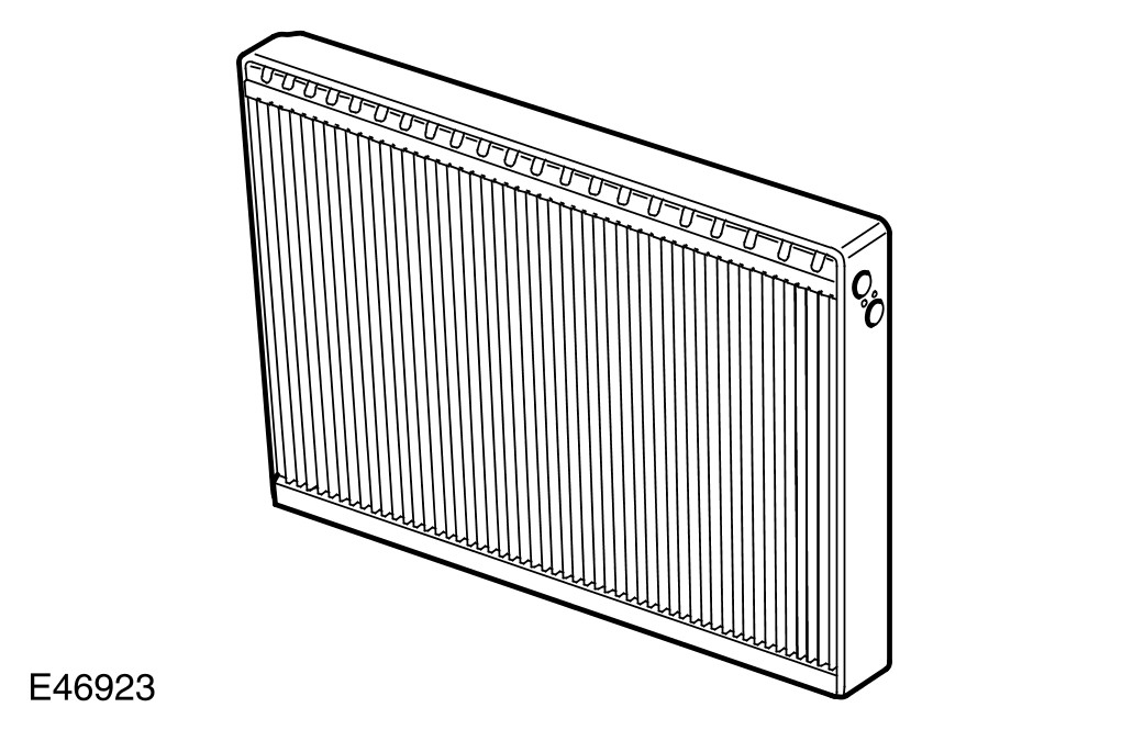The condenser transfers heat from the refrigerant to the surrounding air to convert the vapor from the A/C (air conditioning) compressor into a liquid. A receiver drier module, integrated onto the LH (left-hand) side of the condenser, incorporates a filter and a desiccant to remove solid impurities and moisture from the refrigerant. The receiver drier module also functions as a reservoir for liquid refrigerant, to accommodate changes of heat load at the evaporator.