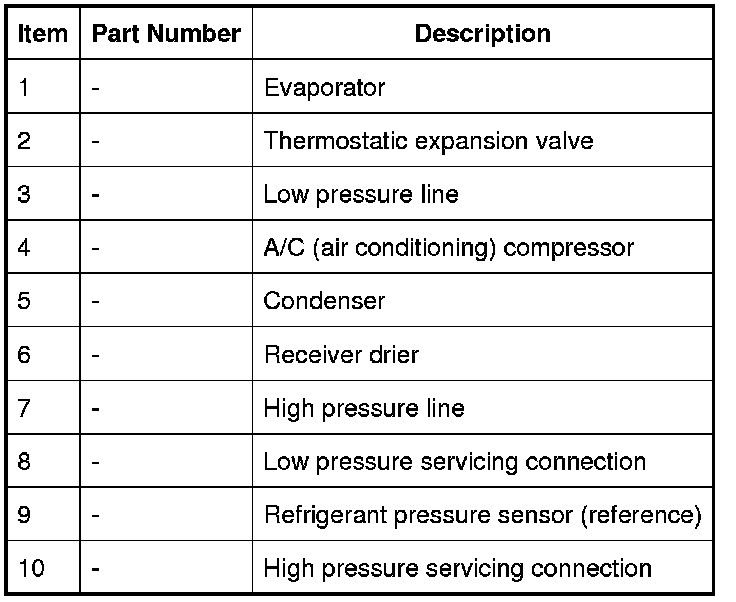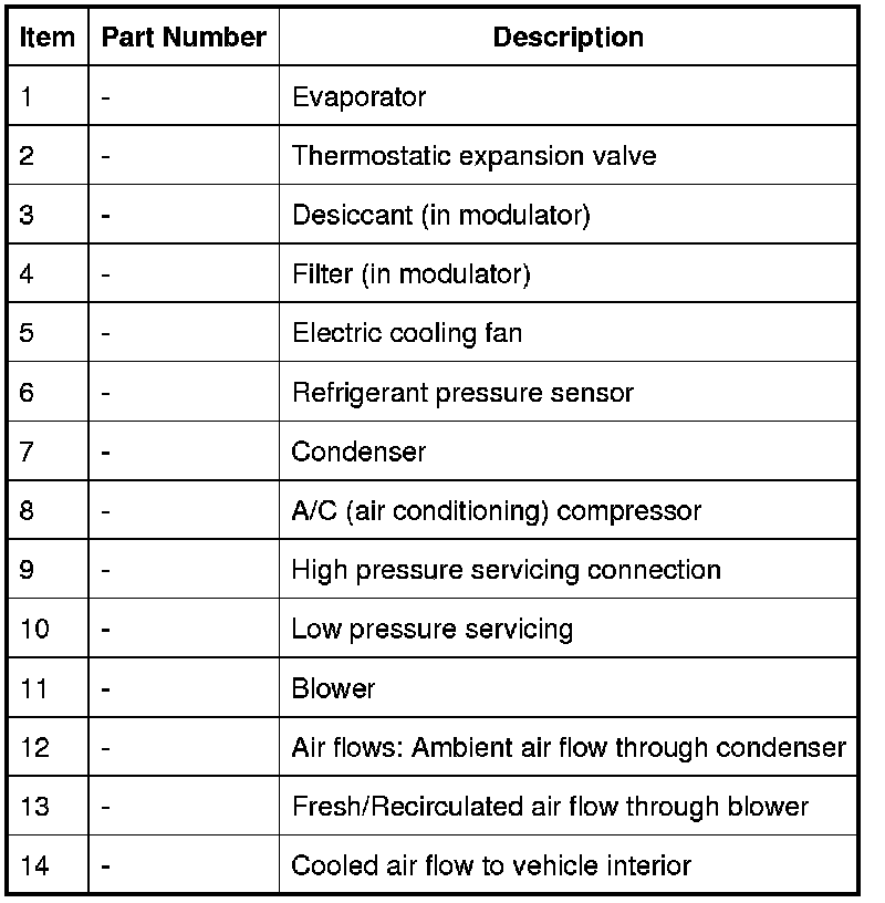 The A/C (air conditioning) system transfers heat from the vehicle interior to the outside atmosphere to provide the heater assembly with dehumidified cool air. The system is a sealed, closed loop, filled with a charge weight of R134a refrigerant as the heat transfer medium. Oil is added to the refrigerant to lubricate the internal components of the A/C (air conditioning) compressor.