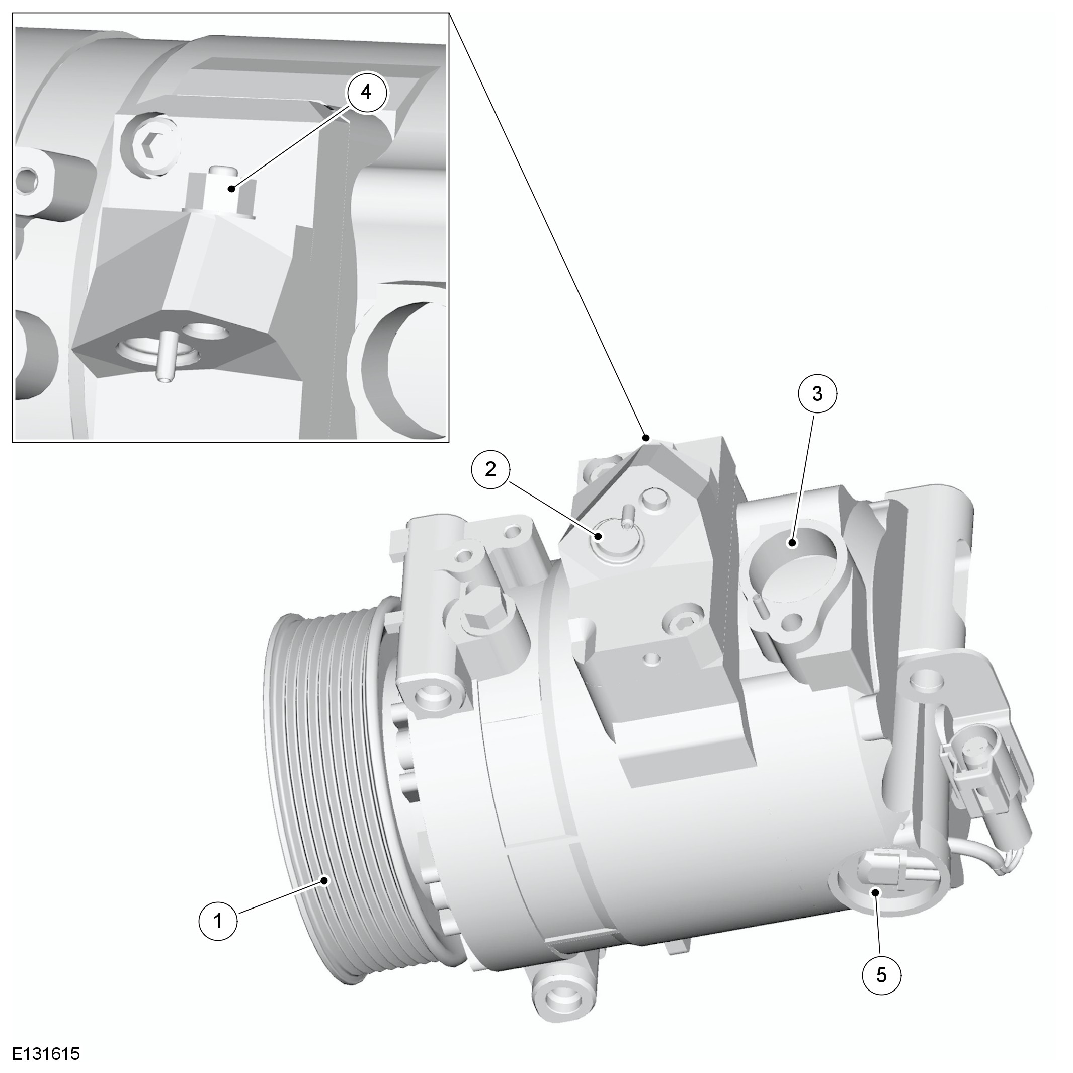 The A/C (air conditioning) compressor circulates refrigerant around the system by compressing low pressure, low temperature vapor from the evaporator and discharging the resultant high pressure, high temperature vapor to the condenser. On 5.0L vehicles, the A/C (air conditioning) compressor is driven directly from the pulley. On 3.0L and 3.6L diesel vehicles the A/C (air conditioning) compressor is driven via an electro-magnetic clutch.