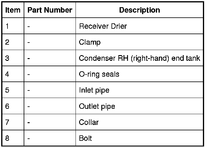 The receiver drier is attached to the two stub pipes on the right end tank of the condenser. A collar, located on lands on the stub pipes and secured with a bolt, attaches the stub pipes to the receiver drier. A clamp secures the body of the receiver drier to a bracket welded to the right end tank of the condenser. The inlet and outlet ports of the receiver drier are the same size, so care must be taken to install the receiver drier the correct way round on the stub pipes; to assist with installation, the inlet port is identified with the word IN etched into the receiver drier.