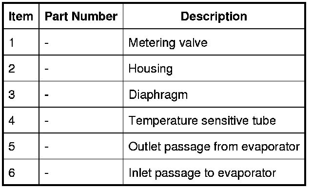 The thermostatic expansion valve is a block type valve located behind the heater assembly, and attached to the inlet and outlet ports of the evaporator. The thermostatic expansion valve consists of an aluminum housing containing inlet and outlet passages. A ball and spring metering valve is installed in the inlet passage and a temperature sensor is installed in the outlet passage. The temperature sensor consists of a temperature sensitive tube connected to a diaphragm. The bottom end of the temperature sensitive tube acts on the ball of the metering valve. Pressure on top of the diaphragm is controlled by evaporator outlet temperature conducted through the temperature sensitive tube. The bottom of the diaphragm senses evaporator outlet pressure.