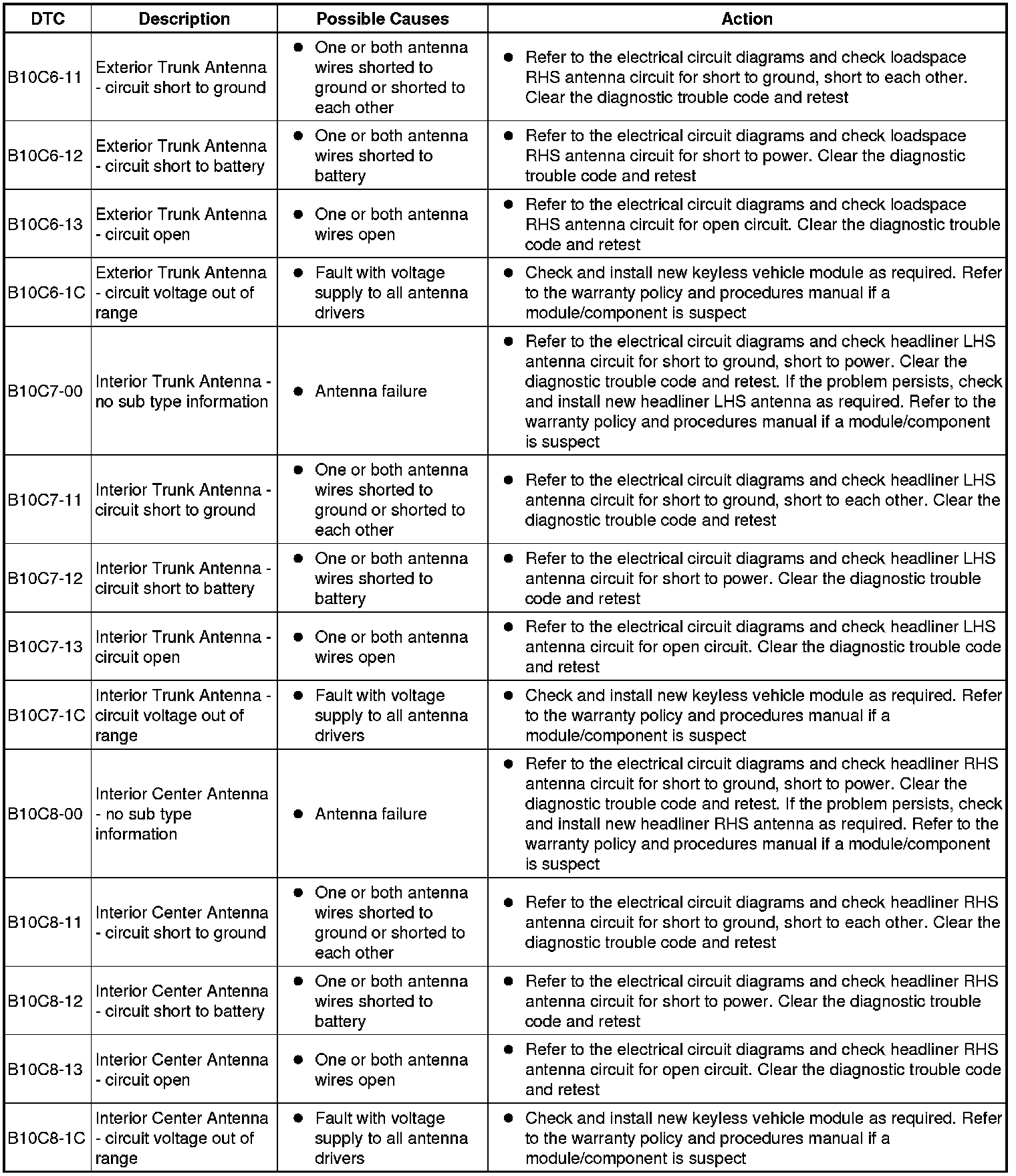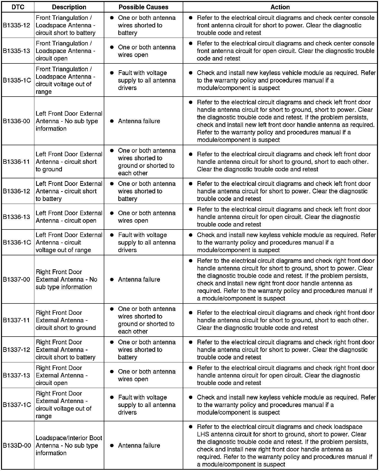 The table below lists all Diagnostic Trouble Codes (DTCs) that could be logged in the Remote Function Actuation Module, for additional Diagnosis and Testing information refer to the relevant Diagnosis and Testing Section. For additional information, refer to Locks, Latches and Entry Systems Testing and Inspection