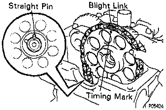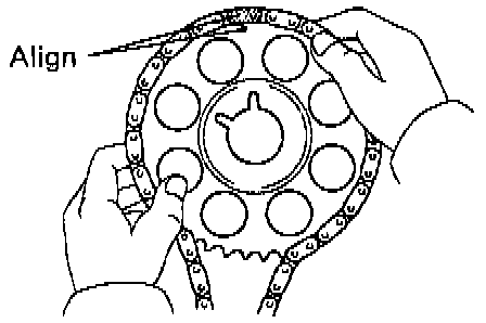 (b) Install the timing chain on the crankshaft timing gear with the other bright link aligned with the timing mark on the crankshaft timing gear.