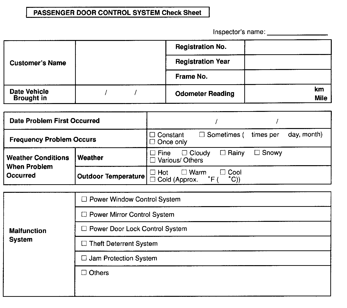 Passenger Door Control System Check List: