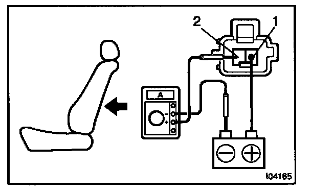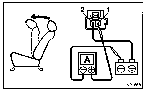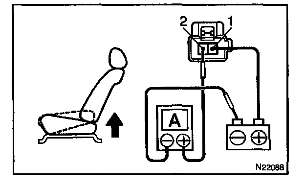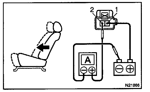 a. Connect the positive (+) lead from the battery to terminal 2, the positive (+) lead from the ammeter to terminal 1 and the negative (-) lead to the battery negative (-) terminal, then recline the seat back to the most forward position.
