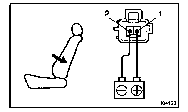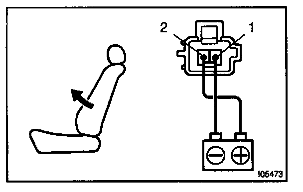 d. Approximately 60 seconds later, connect the positive (+) lead from the battery to terminal 1 and the negative (-) lead to terminal 2, check that the seat back begins to fall backward.