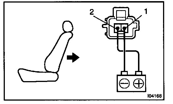 d. Approximately 60 seconds later, connect the positive (+) lead from the battery to terminal 2(1) and the negative (-) lead to terminal 1(2), check that the seat cushion begins to move backwards.
