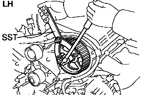 b. Using SST, remove the LH timing pulley.