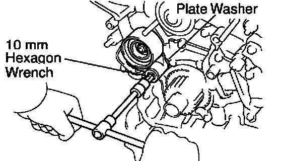 Using a 10 mm hexagon wrench, remove the bolt, idler pulley and plate washer.