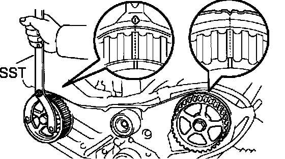 c. Camshaft Timing Pulley Positions: Using SST, turn the camshaft pulley, align the timing marks of the timing pulley and No.3 timing belt cover.