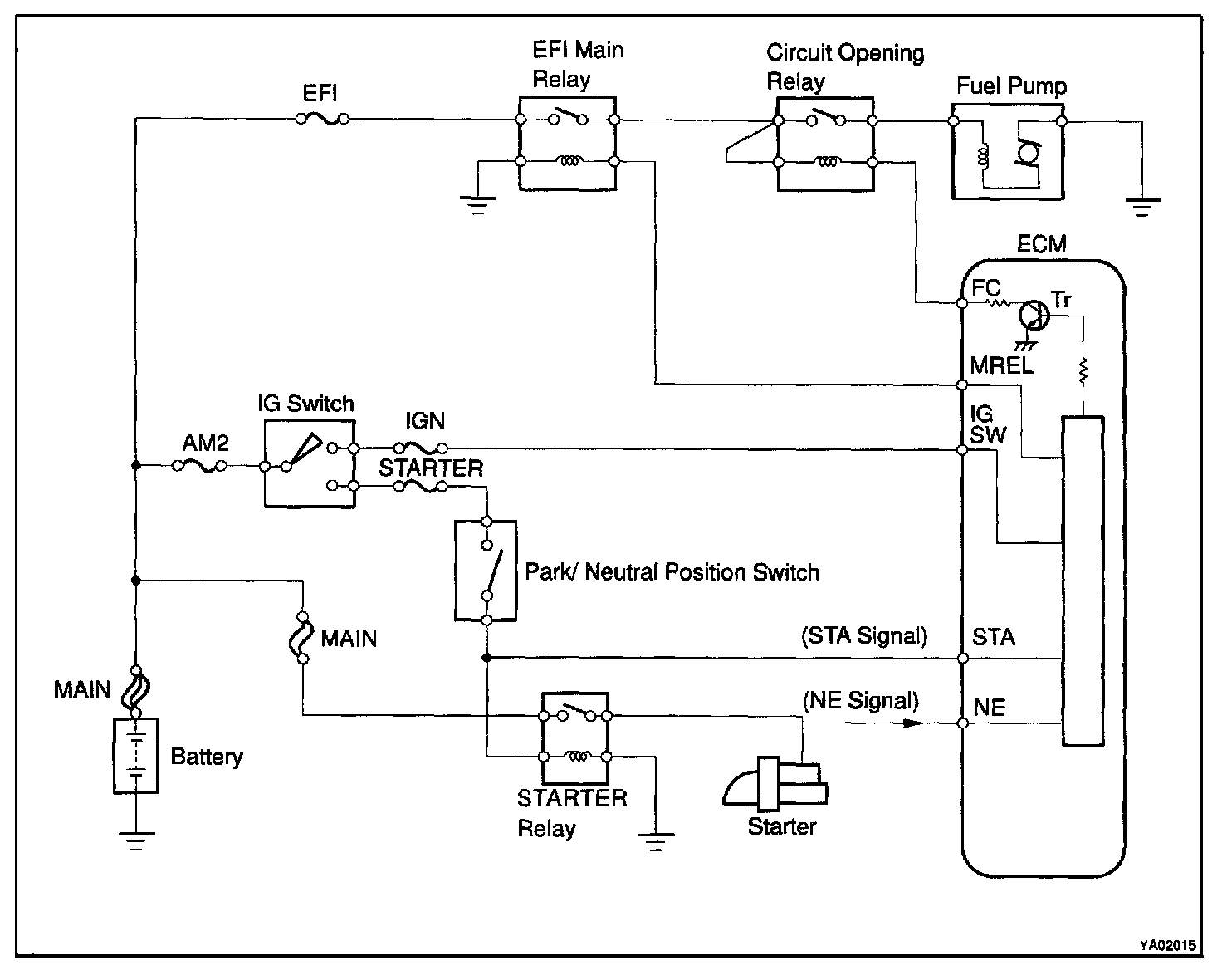 In the diagram, when the engine is cranked, current flows from terminal ST of the ignition switch to the starter relay coil and also current flows to terminal STA of ECM (STA signal).