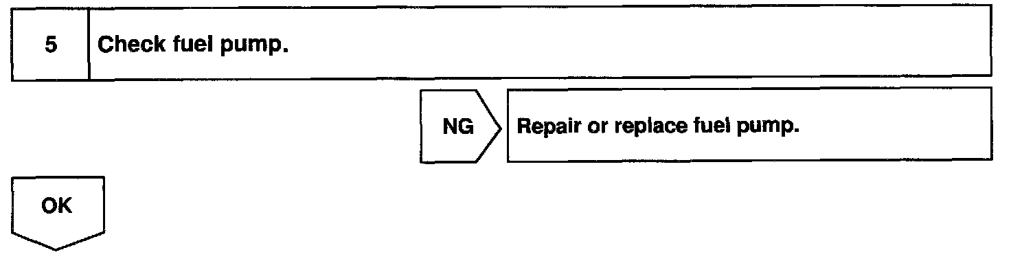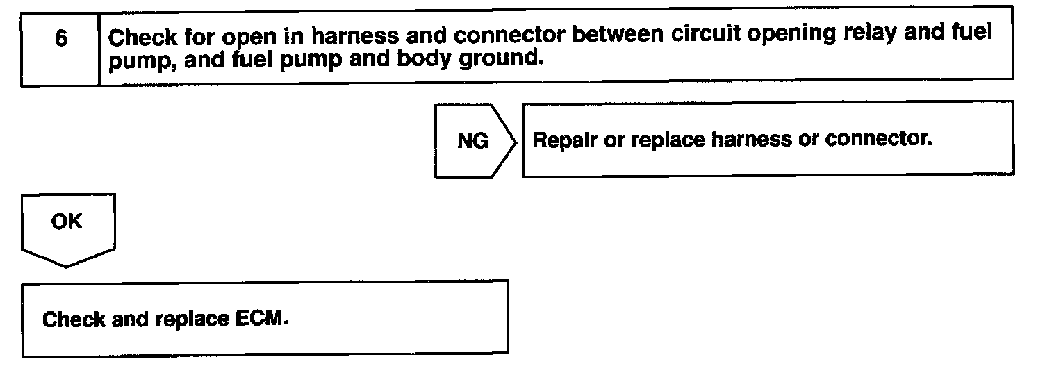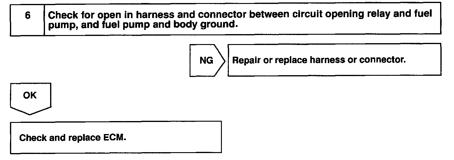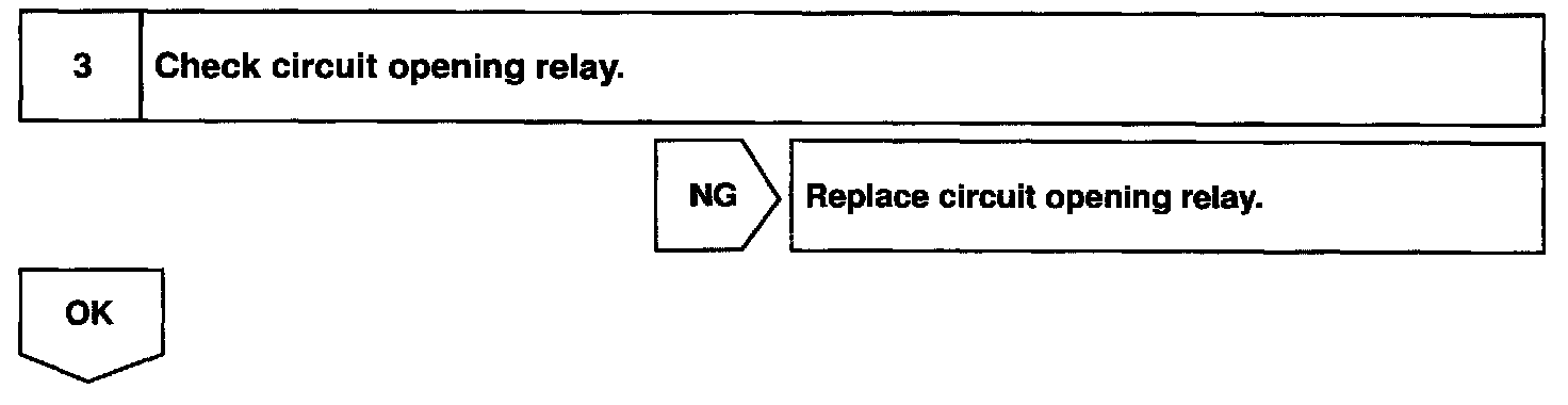 When the STA signal and NE signal are input to the ECM, Tr is turned ON, current flows to coil of the circuit opening relay, the relay switches on, power is supplied to the fuel pump and the fuel pump operates. While the NE signal is generated (engine running), the ECM keeps Tr ON (circuit opening relay ON) and the fuel pump also keeps operating.