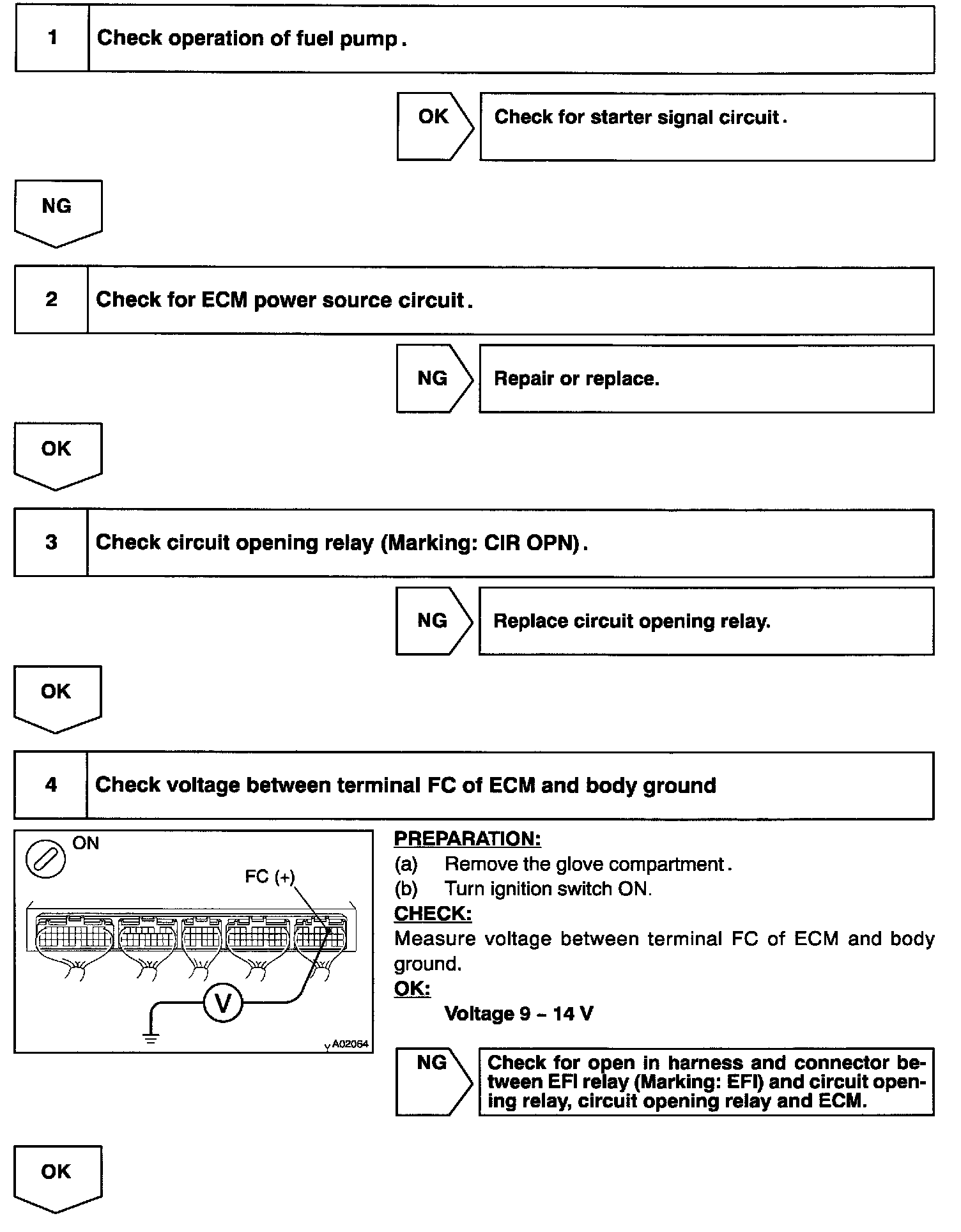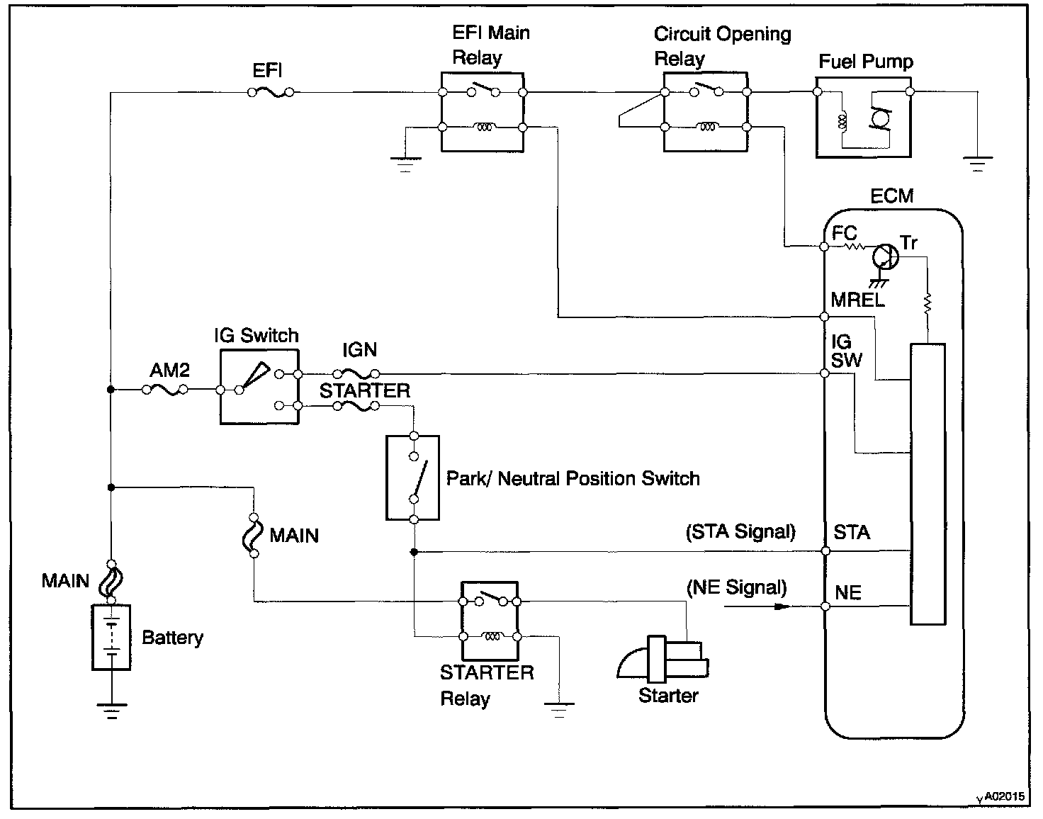 CIRCUIT DESCRIPTIONIn the diagram, when the engine is cranked, current flows from terminal ST of the ignition switch to the starter relay (Marking: ST) coil and also current flows to terminal STA of ECM (STA signal). When the STA signal and NE signal are input to the ECM, Tr is turned ON, current flows to coil of the circuit opening relay (Marking: C/OPN), the relay switches on, power is supplied to the fuel pump and the fuel pump operates.