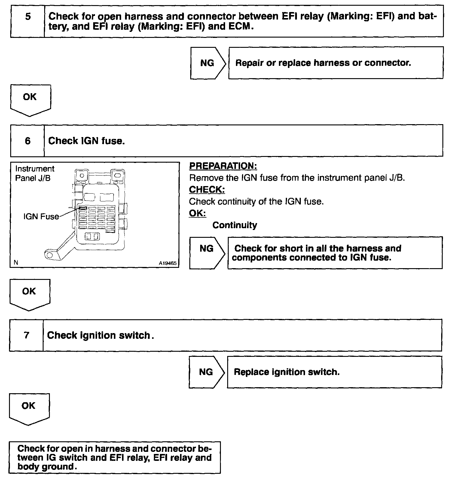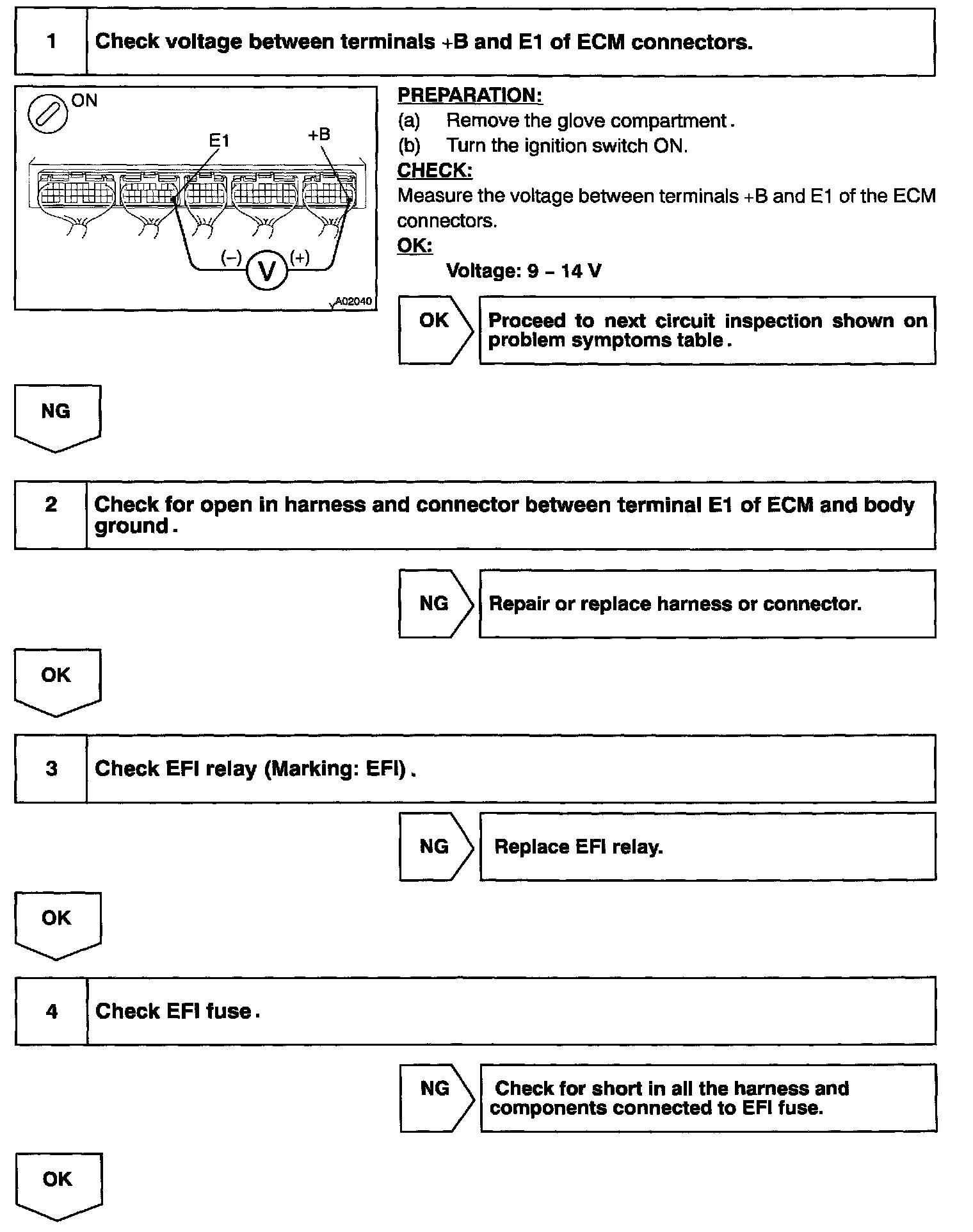 This signal causes current to flow to the coil, closing the contacts of the EFI relay and supplying power to terminal +B of the ECM.