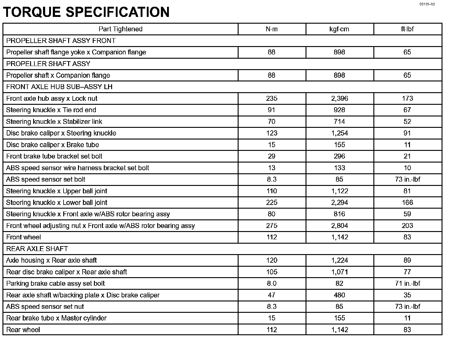 Drive Shaft, Propeller Shaft, Axle - Torque Specification: