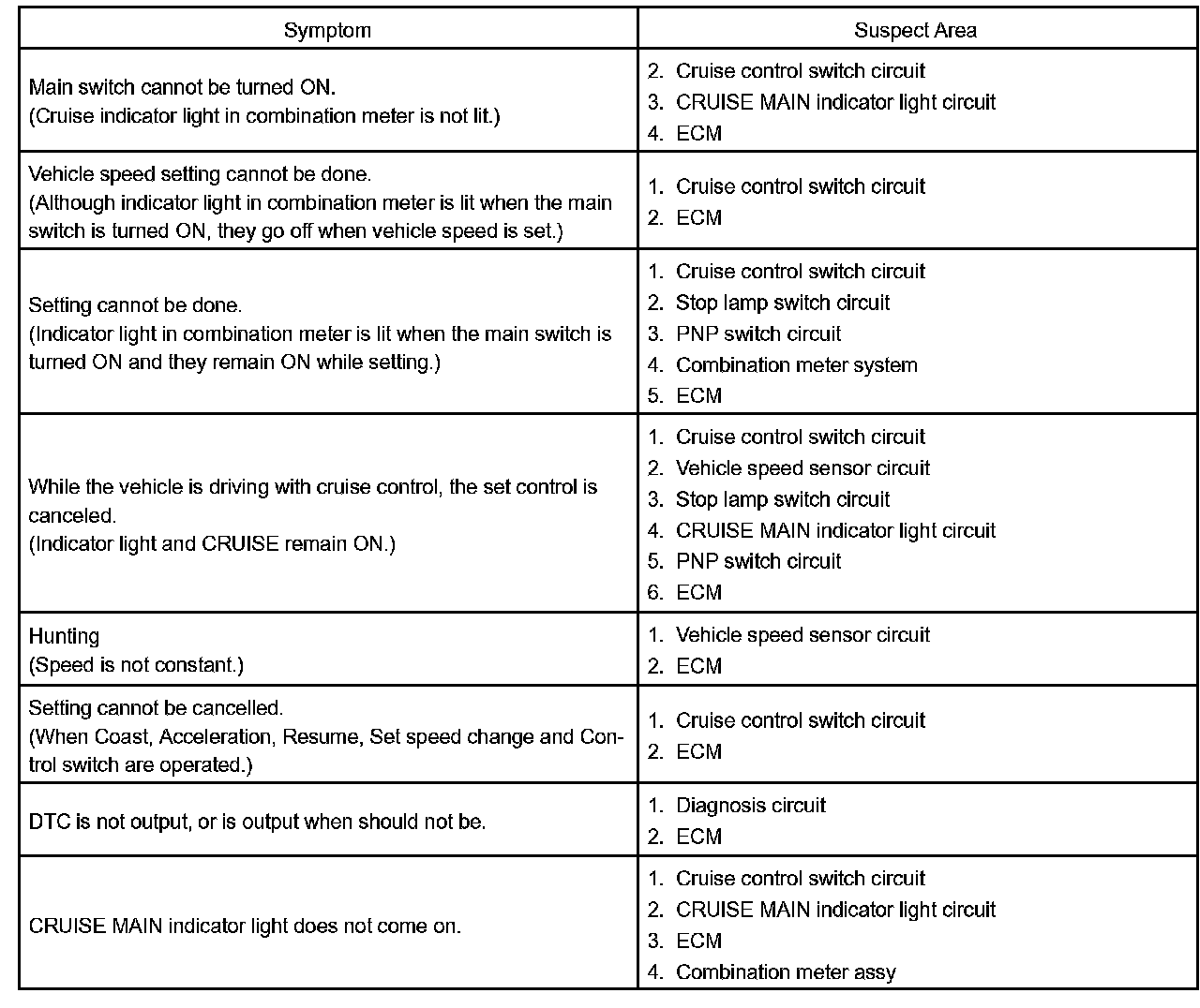 If a normal code is displayed during the DTC check but the problem still occurs, check the circuits for each problem symptom in the order given in the table and proceed to the related troubleshooting.