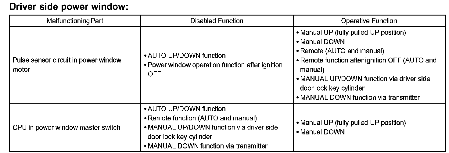If there is a malfunction in the power window system, some of the power window functions will be disabled.