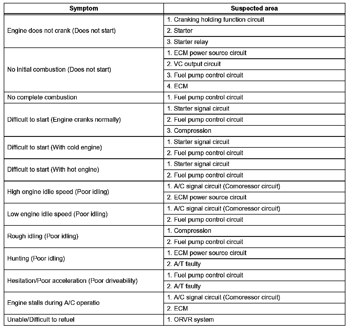 HINT: Use the table to help determine the cause of the problem symptom. The potential causes of the symptoms are listed in order of probability in the "Suspected Area" column of the table. Check each symptom by checking the suspected areas in the order they are listed. Replace parts as necessary.