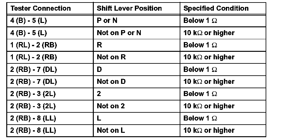 b. Measure the resistance of the PNP switch when the shift lever is moved to each position.