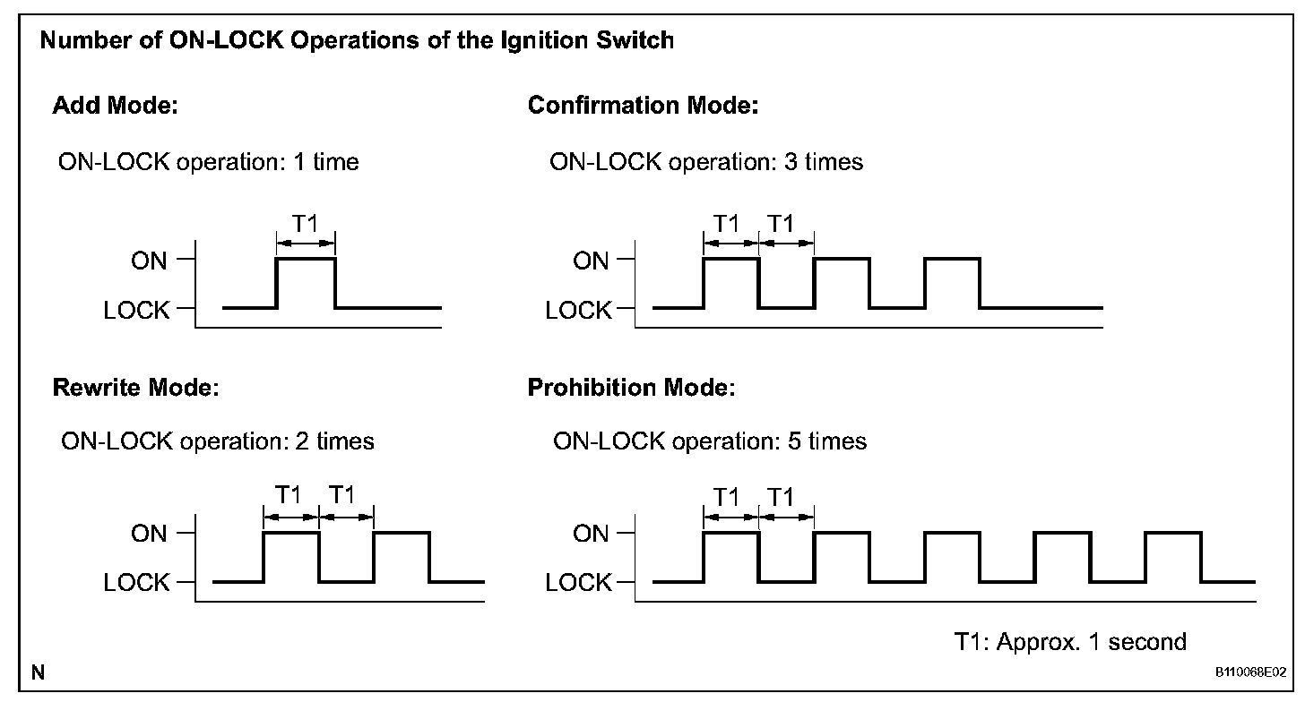 HINT: If the number of ON-LOCK operations of the ignition switch is 0, 4 or 6 or more, there will be no response (power door lock and unlock operation) to show which mode has been selected.