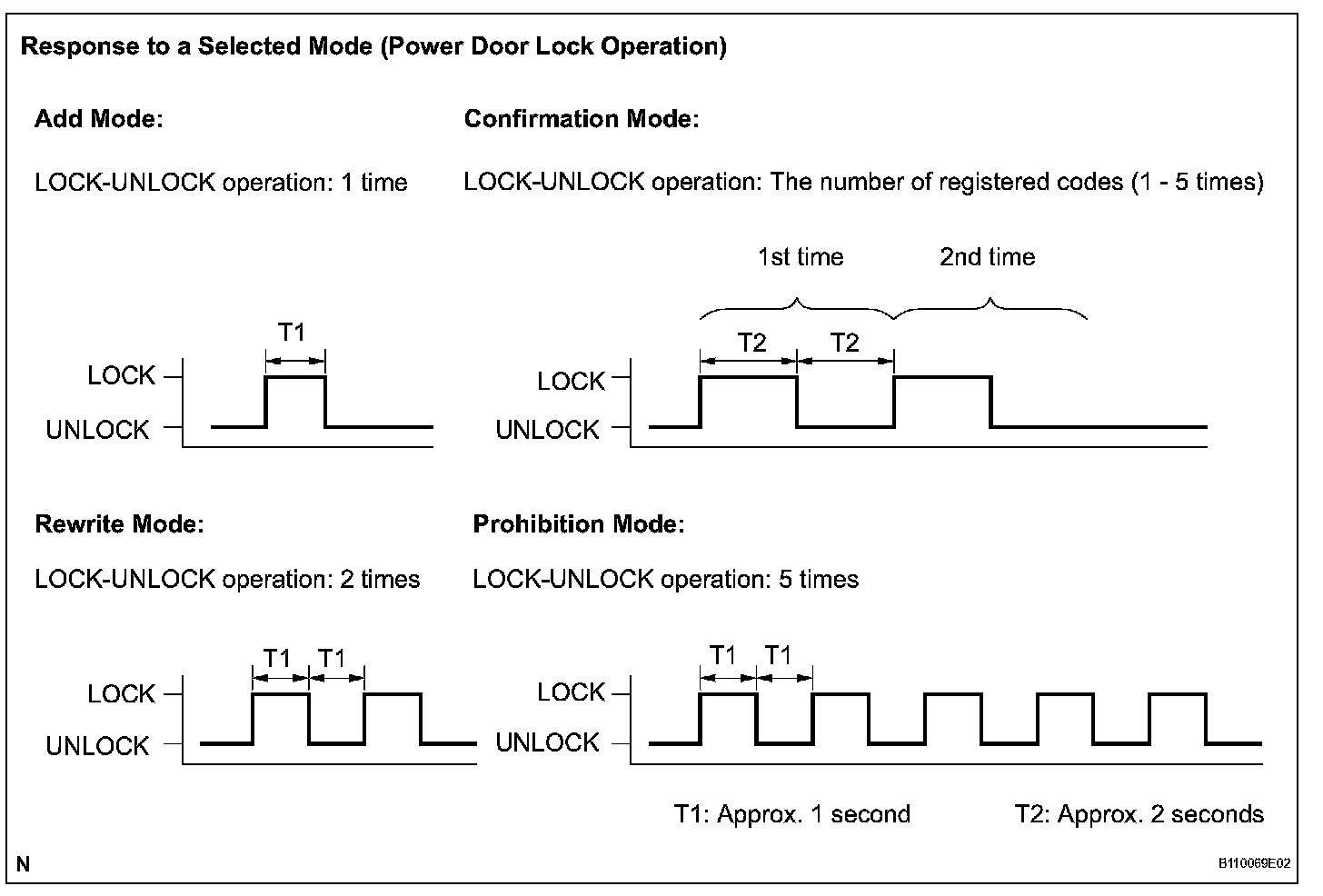 8. The body ECU automatically performs the power door LOCK-UNLOCK operation within 3 seconds after the mode has been selected and informs the technician of the selected mode using the following response patterns.
