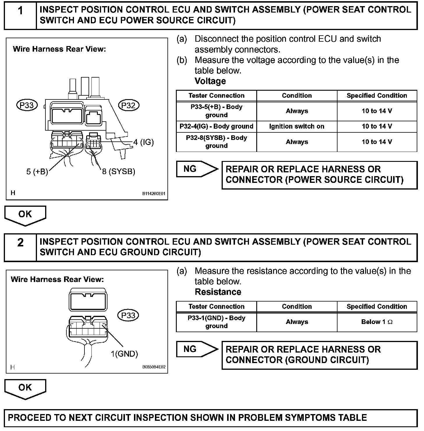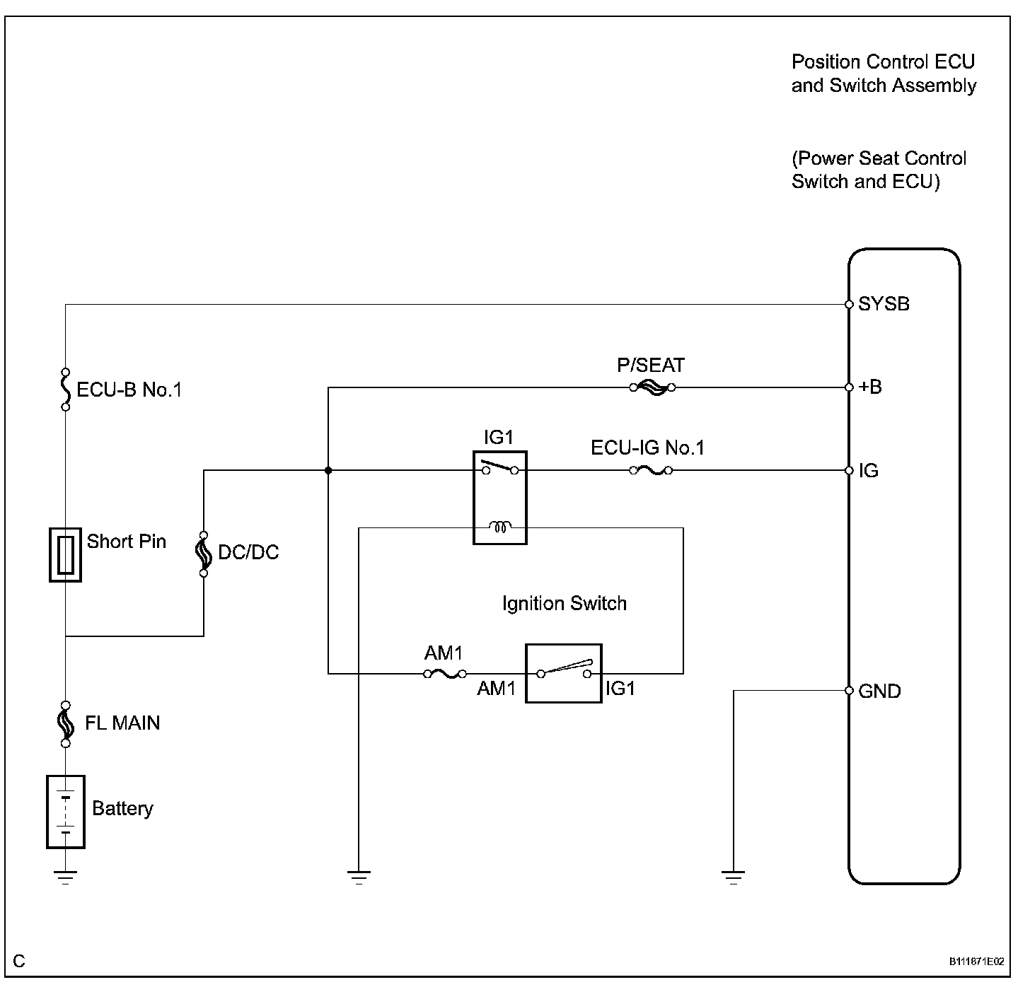 The position control ECU and switch assembly (power seat control switch and ECU) is contained in the switch assembly. During manual operation, only one switch signal is accepted. If signals are input from 2 or more switches simultaneously, all of them are ignored, except when signals are input from the front vertical switch and lifter switch simultaneously. In this case, the signal from the lifter will operate. During automatic operation, a manual switch input will override any other operations, i.e. automatic operations will stop and the manual input operation only will be accepted. For example, if a manual switch input is activated during a seat store/restore operation, the previous operation will cease and manual operation will be performed. After the manual operation is performed, the previous automatic operation will not resume. The power mirror store/restore operation is unaffected by manual switch inputs. The front power seat switch does not allow the restore operation of the power seat when the system detects that the voltage of terminal SYSB is less than 8.0 ± 0.5 V for 30 msec. or is more than 10 ± 0.5 V for 30 msec. This circuit is the power source circuit for the position control ECU and switch assembly (power seat control switch and ECU).