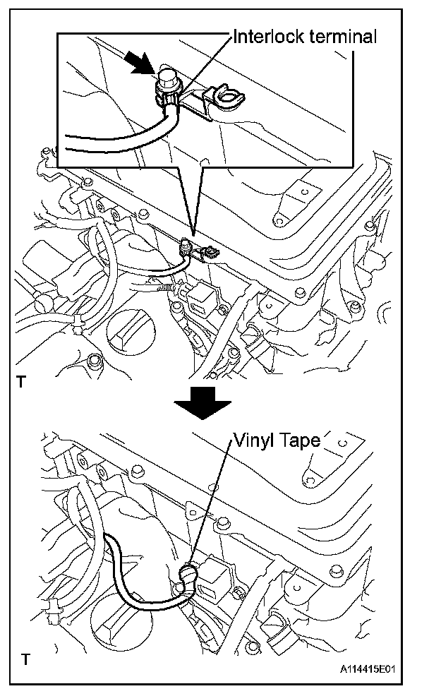 c. After removing the inverter cover, wrap the interlock round terminal for the inverter cover with vinyl tape to prevent it from shorting to ground.