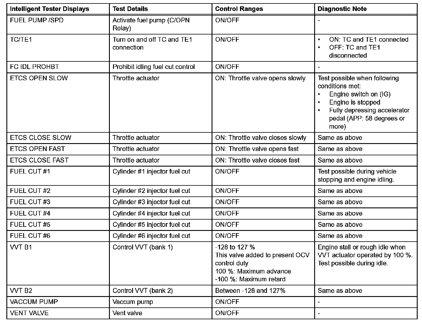 f. Perform the ACTIVE TEST by referring to the table given.