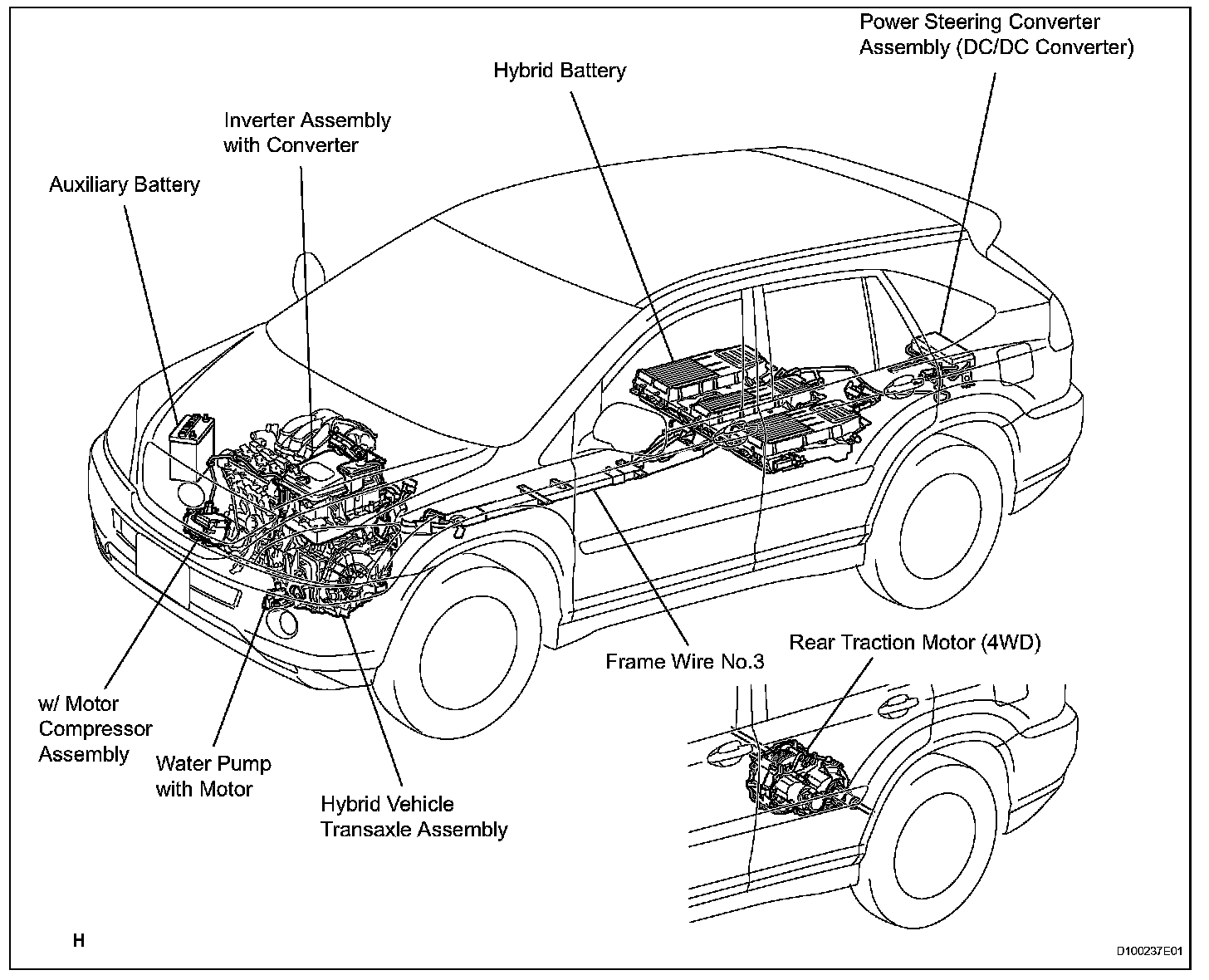 NOTE: The RX400h hybrid system contains a 288V high voltage system with a strong alkali solution of potassium hydroxide. Be sure to follow the instructions in this manual to handle the system\correctly. Failure to do so may result in serious injury or electrocution.
