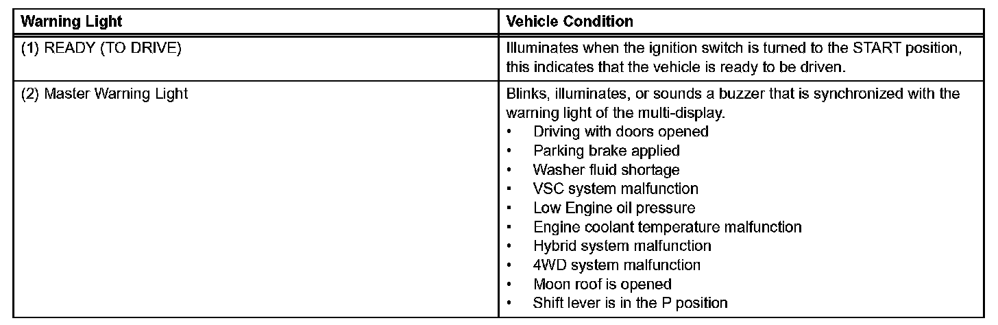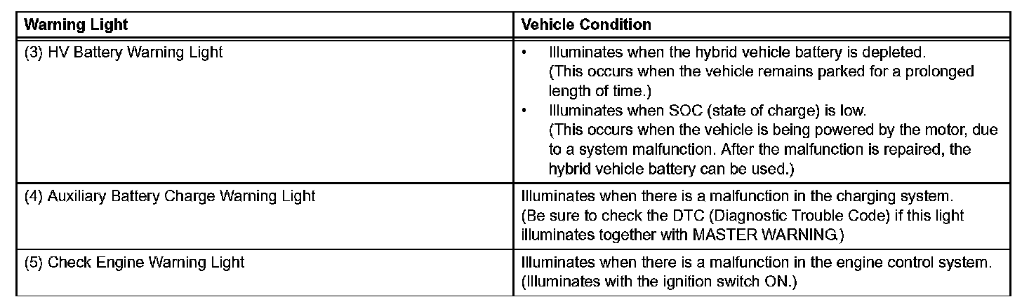 a. If one of the warning lights 2. to 5. becomes lit, connect an intelligent tester to the DLC3 connector to check the DTCs (Diagnostic Trouble Codes). Then, refer to the applicable troubleshooting steps in this manual to inspect and repair the affected area. The foregoing actions are also required if the READY light does not illuminate when the vehicle is first started.