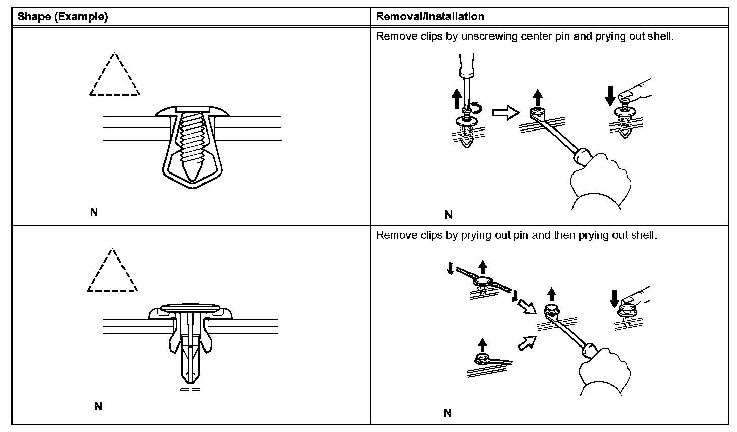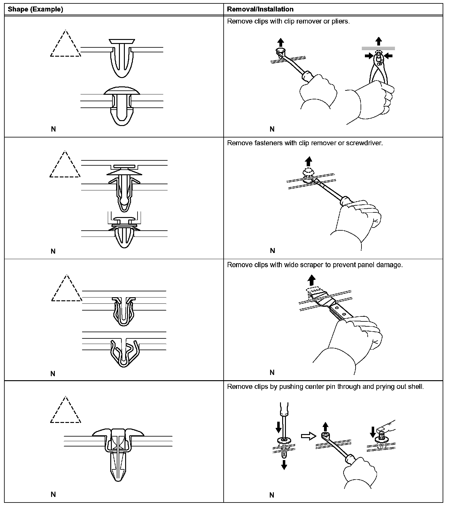 1. The removal and installation methods of typical clips used for vehicle body parts are shown in the table.