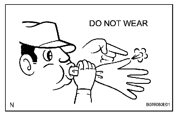2. Check the HV battery and immediate area for any electrolyte leakage. Do not touch any leaked liquid because it could be highly alkaline electrolyte. Wear rubber gloves and goggles, neutralize the liquid with saturated boric acid solution, and then apply red litmus paper to the leak. Check that the paper does not turn blue. Wipe the neutralized liquid with a shop rag or piece of cloth.