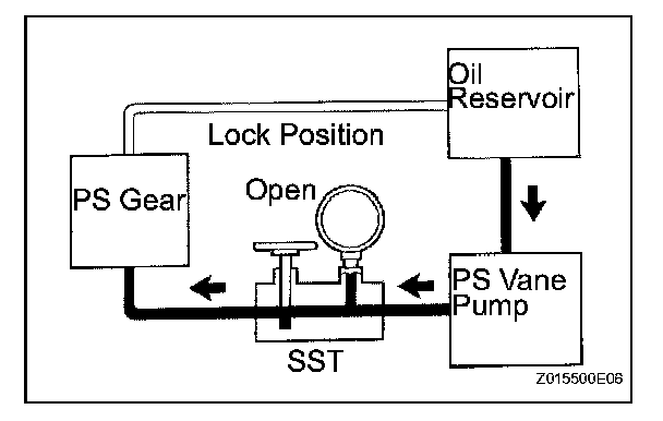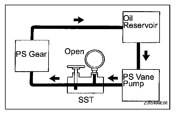 (i) With the engine idling and the valve fully opened, turn the steering wheel left or right to the full lock position. Observe the reading on the SST.