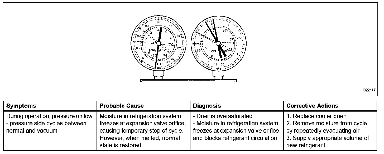 2. The A/C system periodically changes between normal and improper function due to moisture in the refrigeration system.