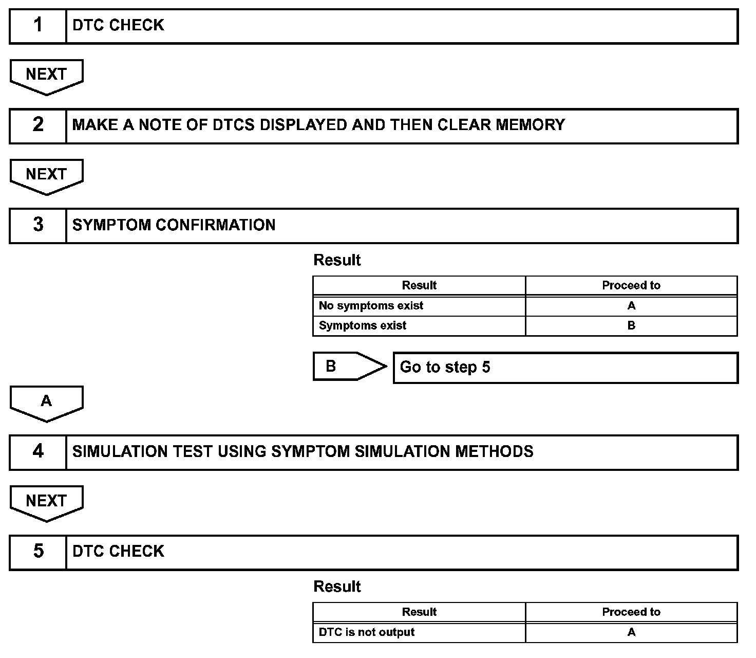 - In the DTC check, it is very important to determine whether the problem indicated by the DTC either: 1) still occurs, or 2) occurred in the past but has returned to normal. In addition, the DTC should be compared to the problem symptom to see if they are related. For this reason, DTCs should be checked before and after confirmation of symptoms (i.e., whether or not problem symptoms exist) to determine current system conditions, as shown in the flowchart.