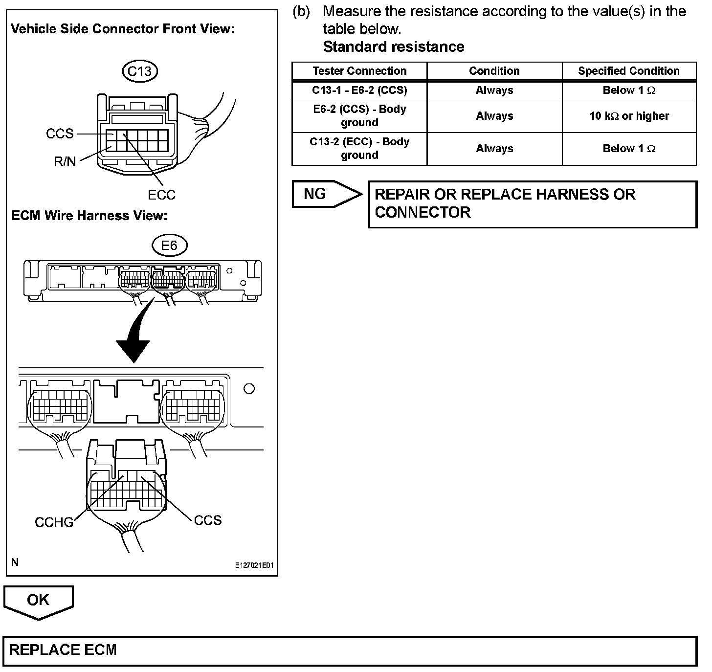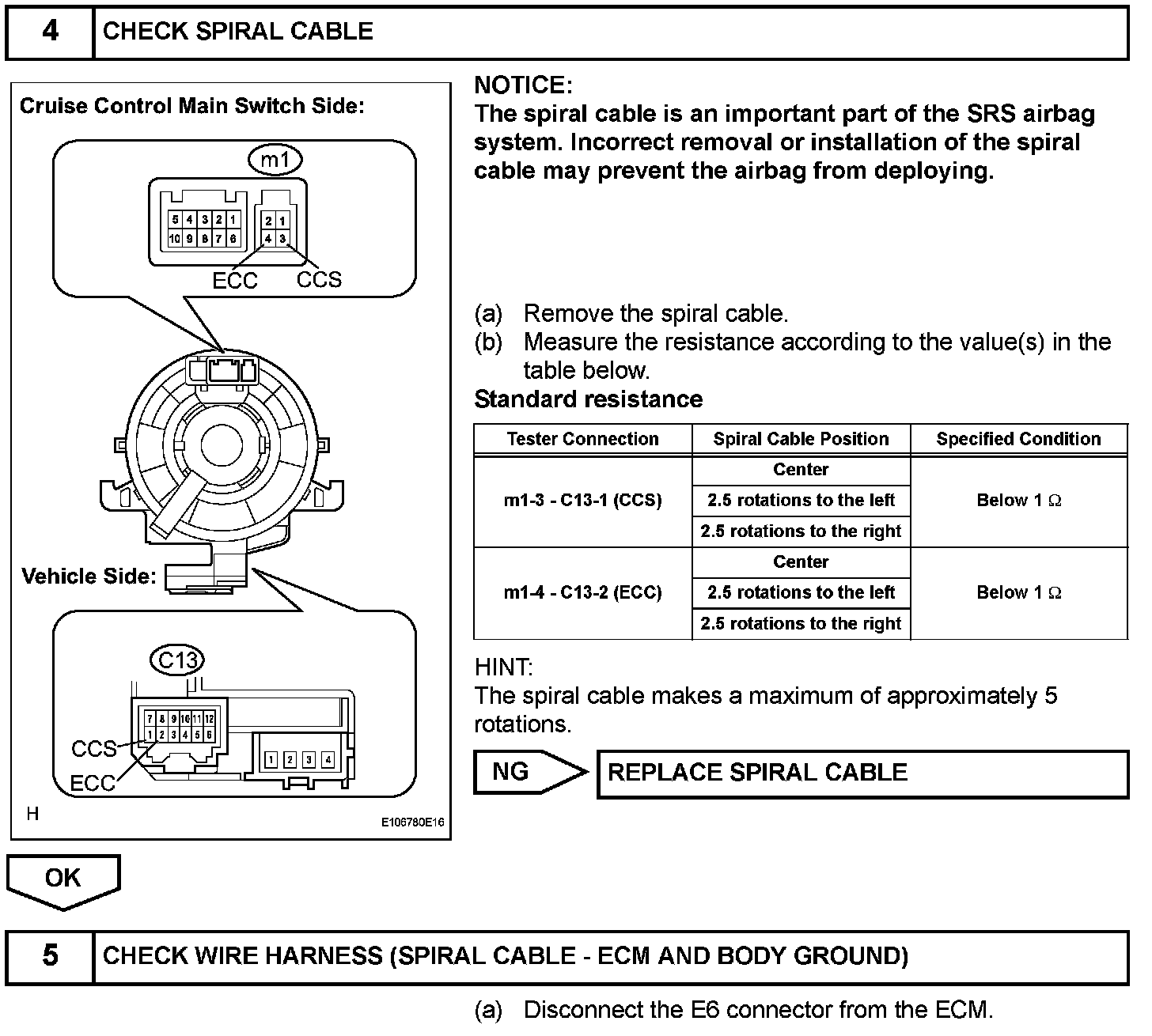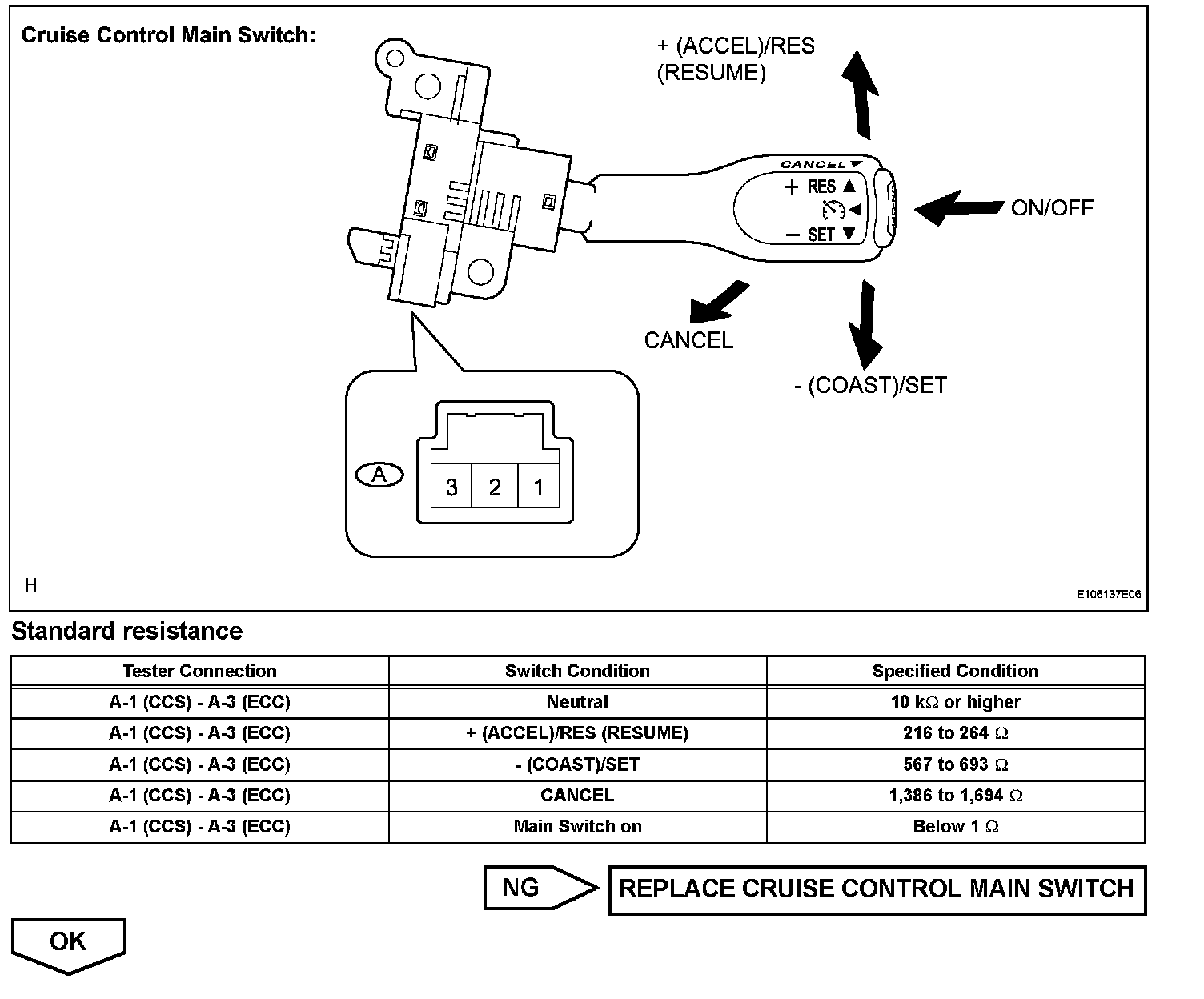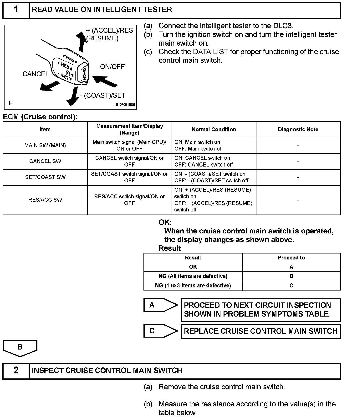 The cruise control main switch operates 7 functions: SET, - (COAST), TAP-DOWN, RES (RESUME), + (ACCEL), TAP-UP, and CANCEL. The SET, TAP-DOWN, and - (COAST) functions, and the RES (RESUME), TAP-UP, and + (ACCEL) functions are operated with the same switch. The cruise control main switch is an automatic return type switch which turns on only while operating it in the direction of each arrow and turns off after releasing it. The internal contact point of the cruise control main switch is turned on with the switch operation. Then the ECM reads the voltage value that has been changed by the switch operation to control SET, - (COAST), RES (RESUME), + (ACCEL), and CANCEL.