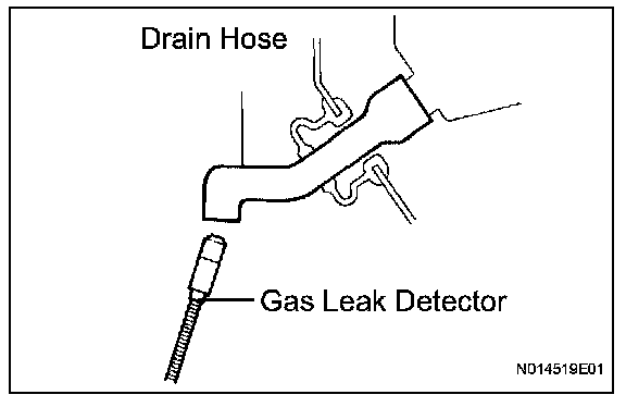 - When bringing the gas leak detector close to the drain hose, make sure that the gas leak detector does not react to volatile gases. If such reaction is unavoidable, the vehicle must be lifted up.