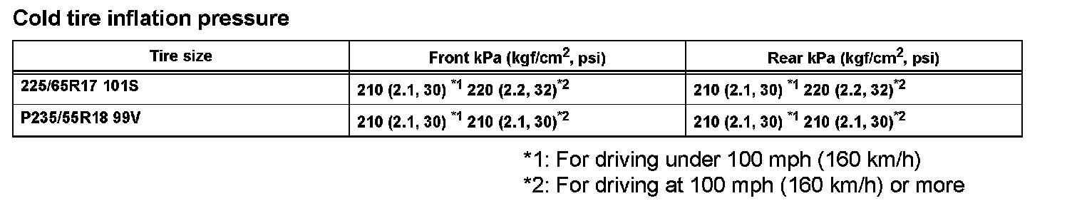 ^ Perform the tire pressure adjustment after the vehicle has sufficiently cooled down. If the vehicle is not sufficiently cooled down, increase the air pressure by 20 to 30 kPa (0.2 to 0.3 kgf/cm2, 2.9 to 4.35 psi) above the specified value.