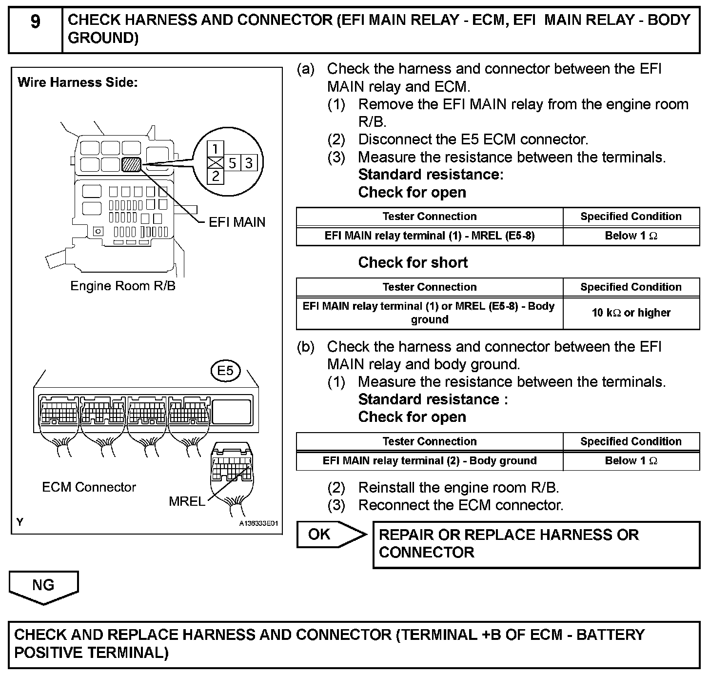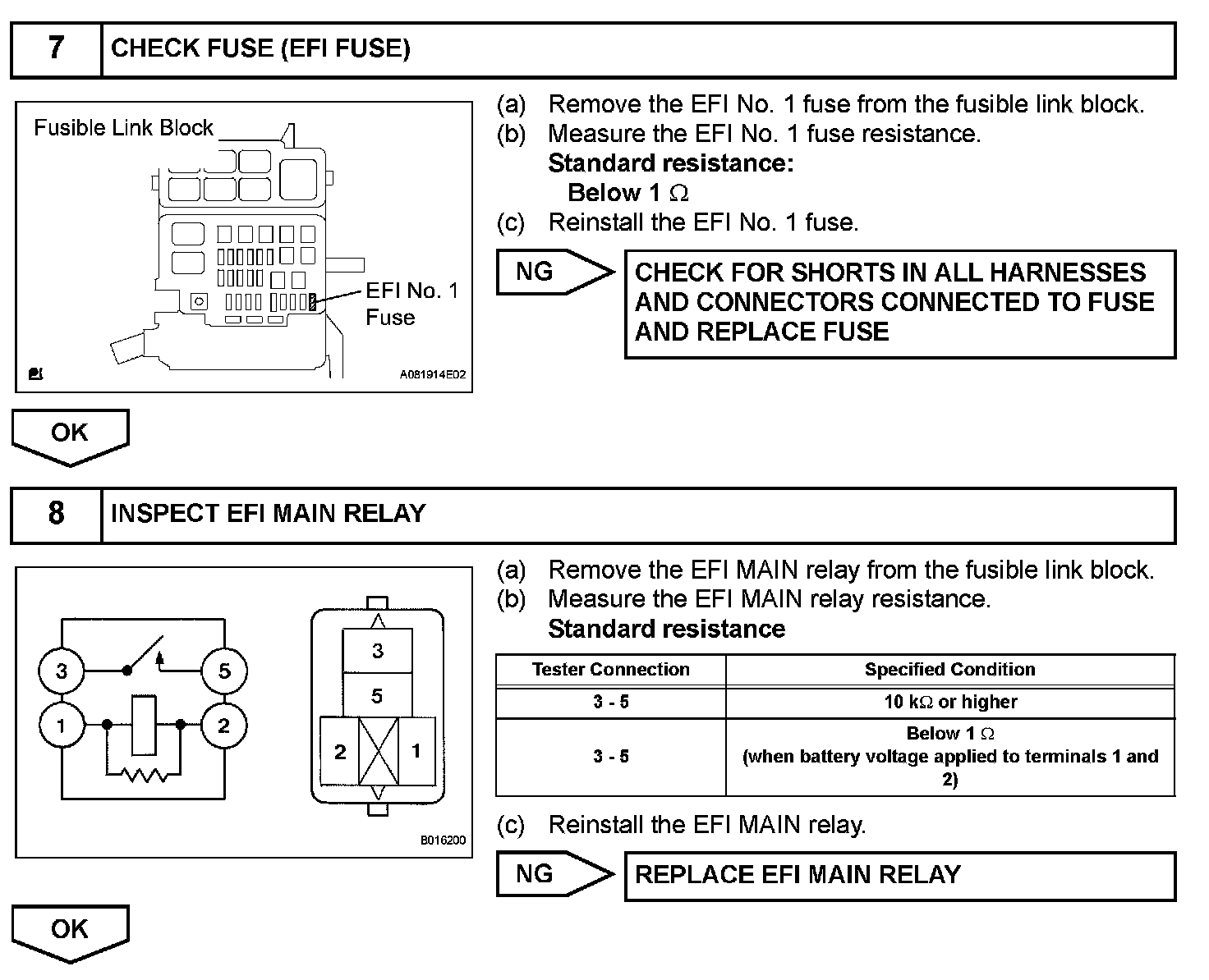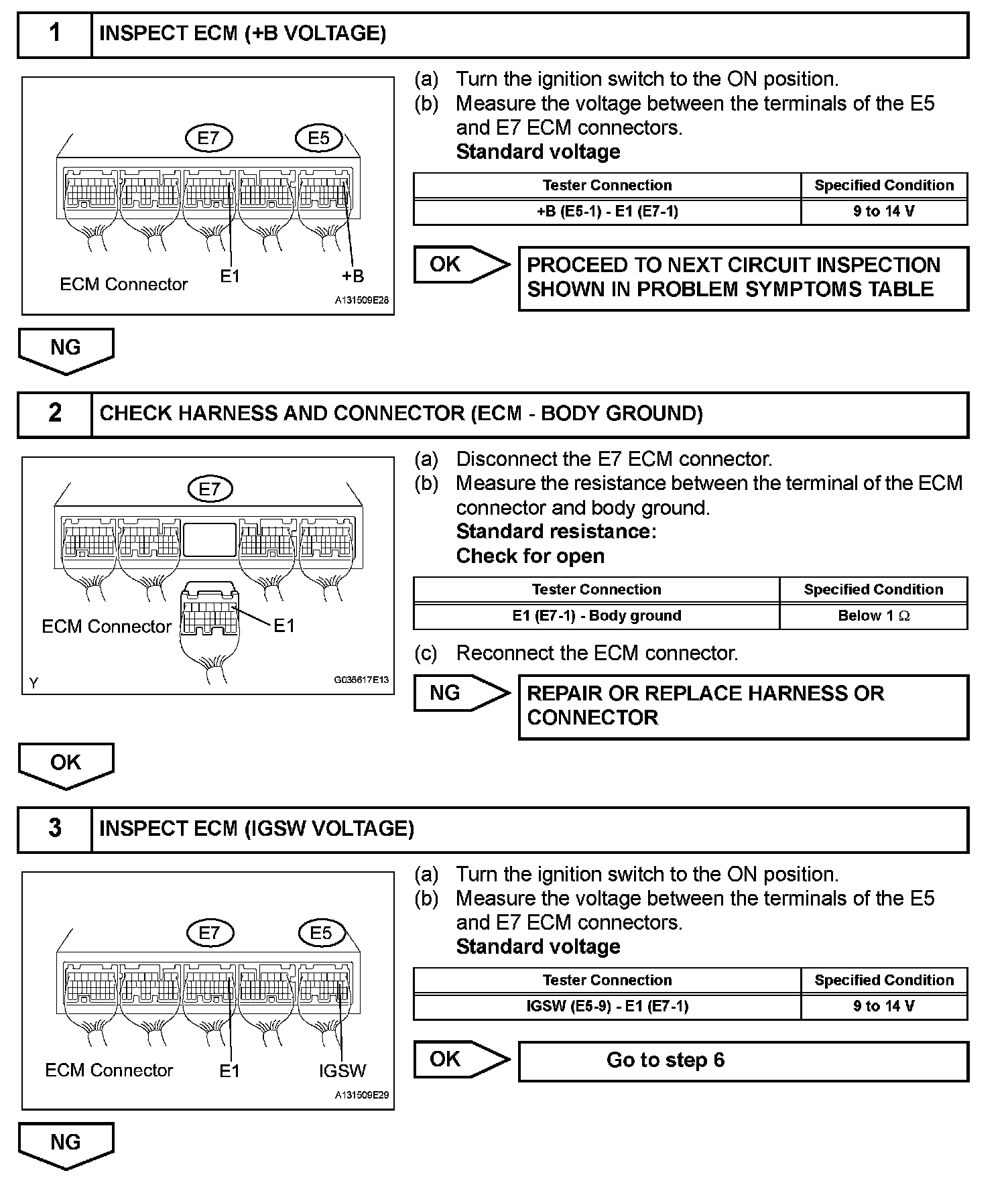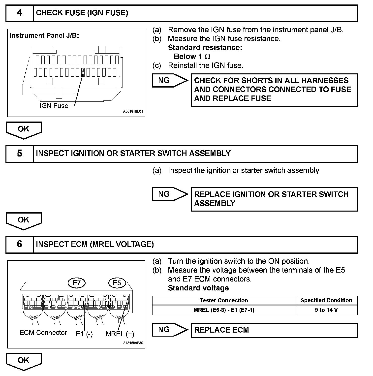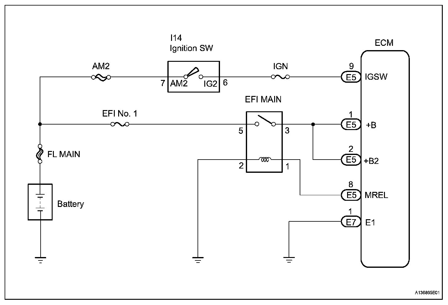 When the ignition switch is turned to the ON position, the battery voltage is applied to terminal IGSW of the ECM. The ECM MREL output signal causes a current to flow to the coil, closing the contacts of the EFI relay and supplying power to terminal +B of the ECM.