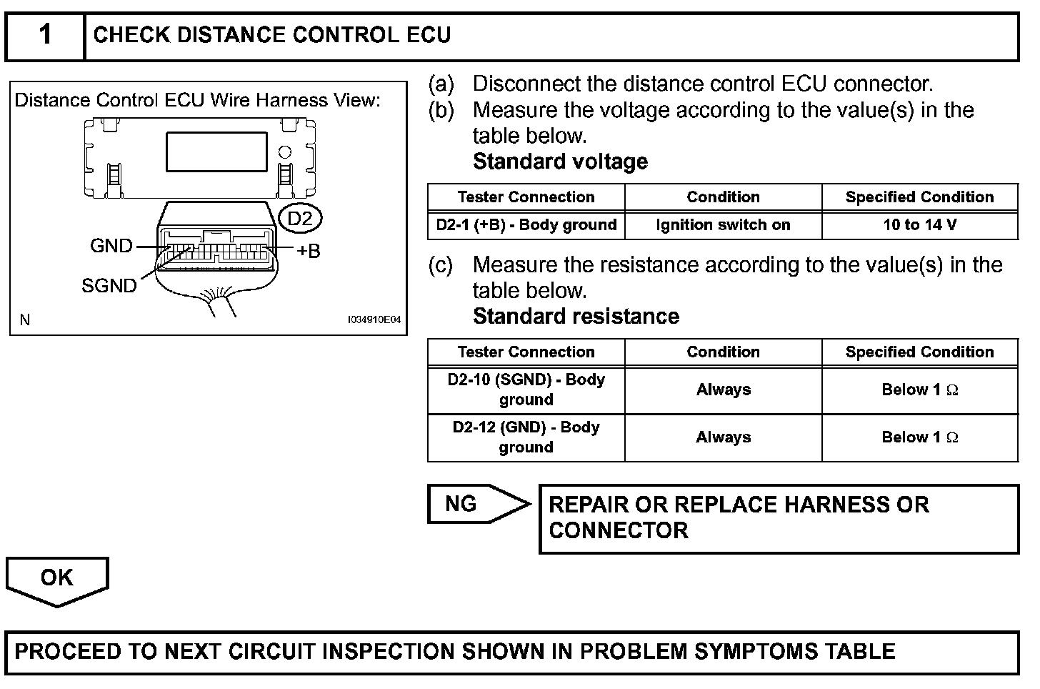 This circuit provides power to operate the distance control ECU (cruise control ECU). The distance control ECU determines information about the vehicle in front based on data from the laser sensor, and then decides how much acceleration and/or deceleration is needed to maintain the set distance. The distance control ECU also requests the skid control ECU to apply braking and sound the buzzer.