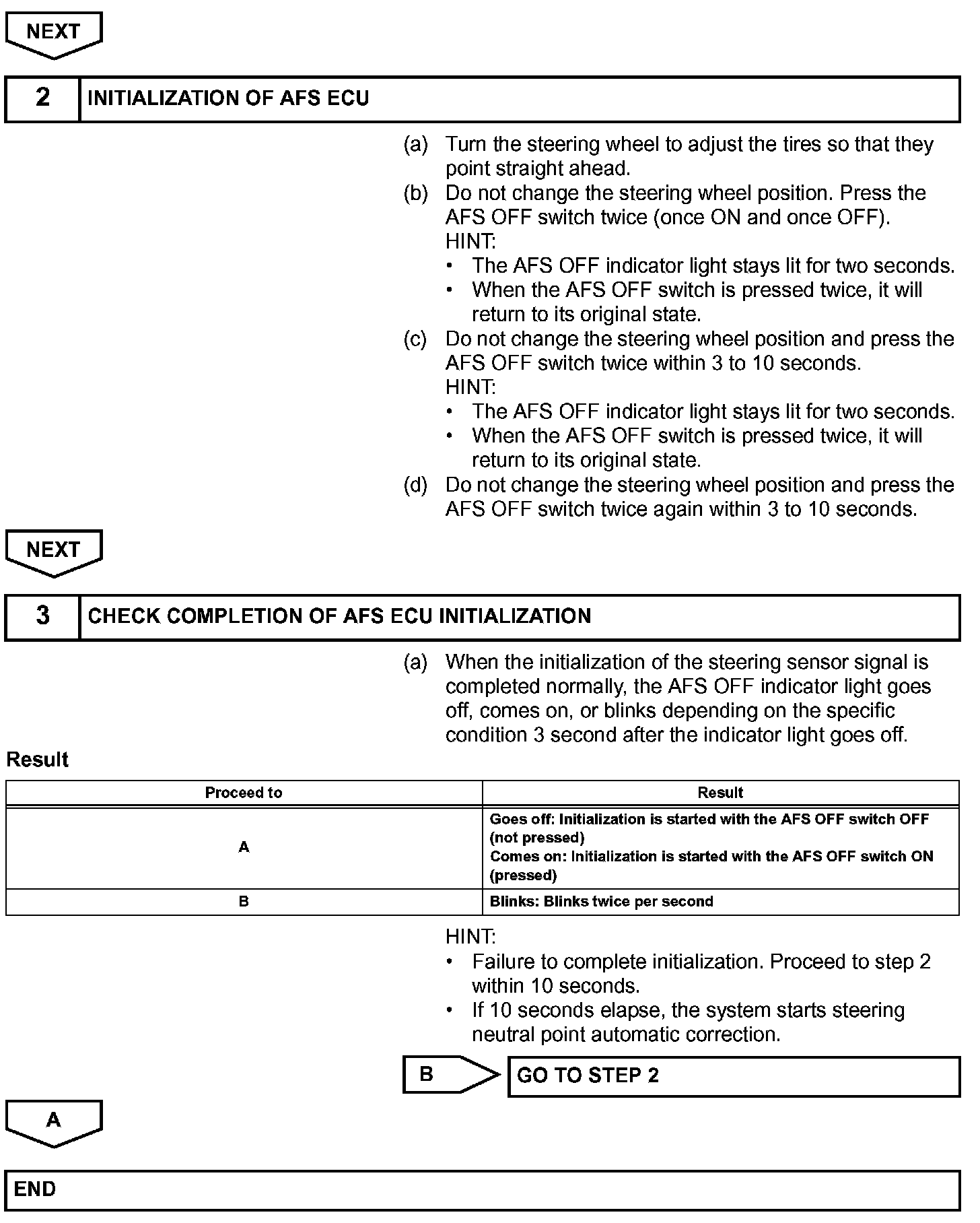 NOTE: This operation manually initializes the steering sensor when AFS operation is not normal due to abnormal automatic correction after completion of AFS INITIALIZATION.