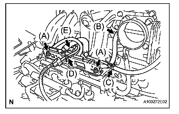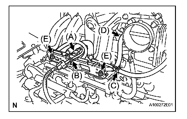 e. Remove the 2 nuts (E), then remove the emission control valve set.