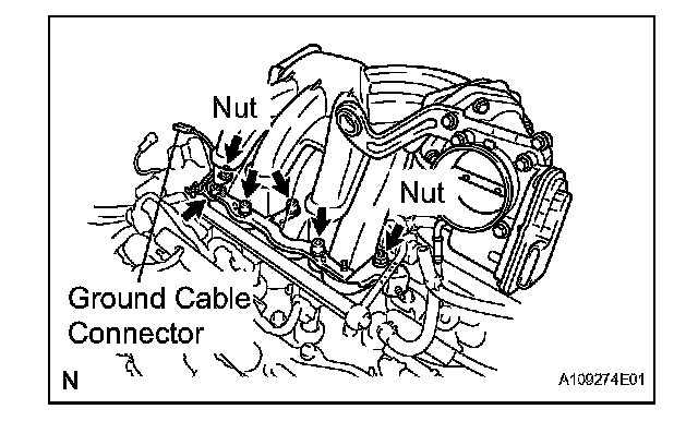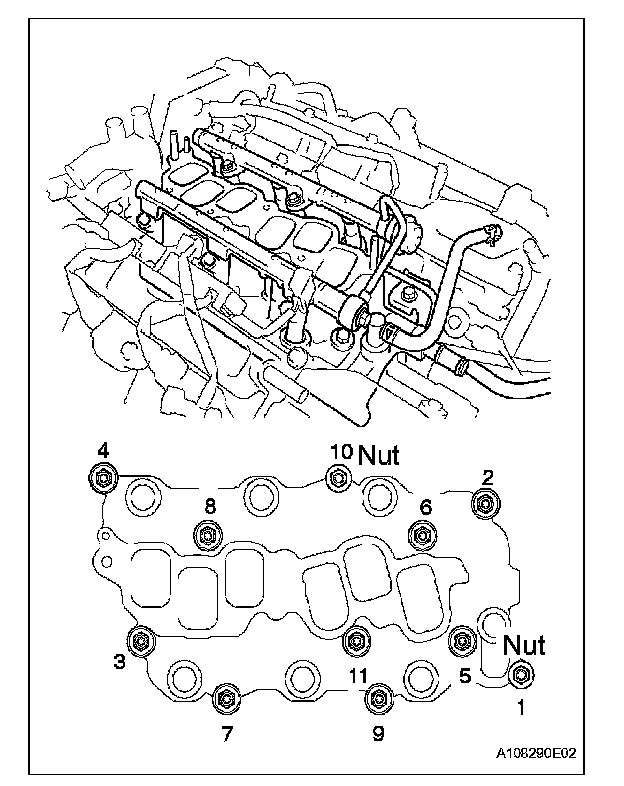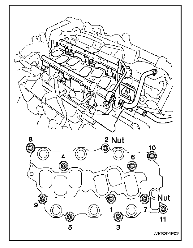 c. In order to remove the intake manifold, using several steps, remove the 9 bolts and 2 nuts in the sequence shown in the illustration.