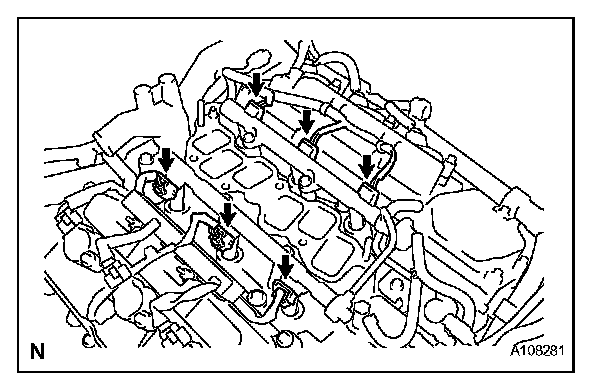b. Using a socket hexagon wrench 8 mm, install the intake manifold with the 4 bolts and 2 nuts . Using several steps, tighten the bolts and nuts uniformly in the sequence shown in the illustration.