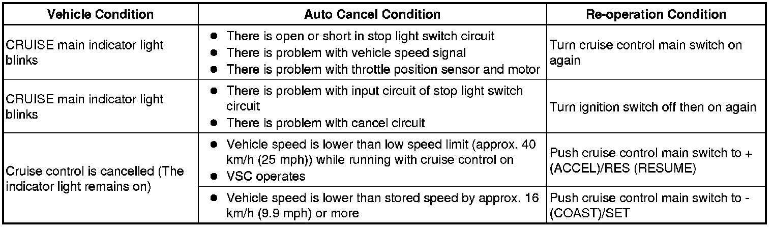 HINT: If the following conditions are detected while the cruise control is in operation, the system clears the stored vehicle speed in the ECM and cancels the cruise control operation.