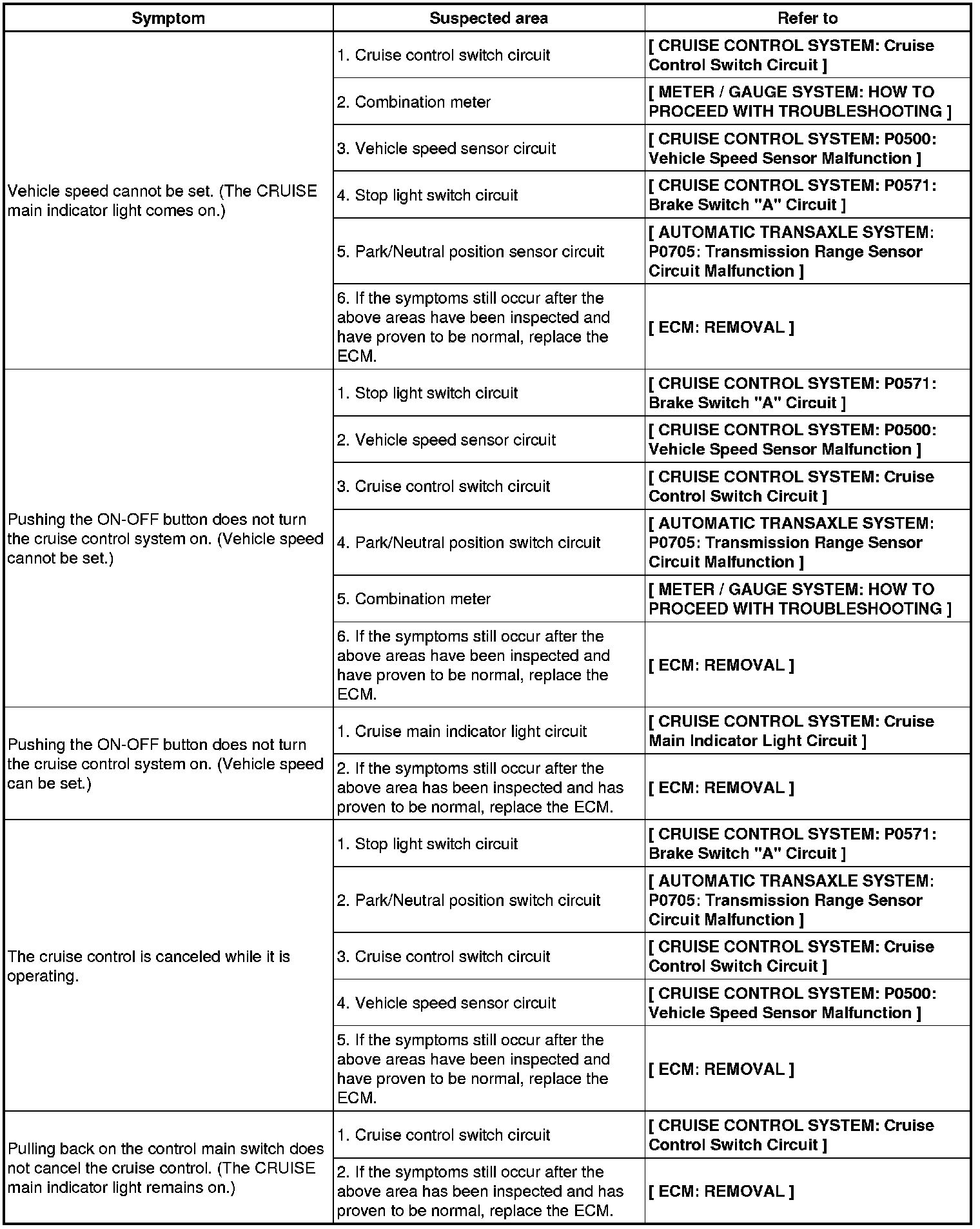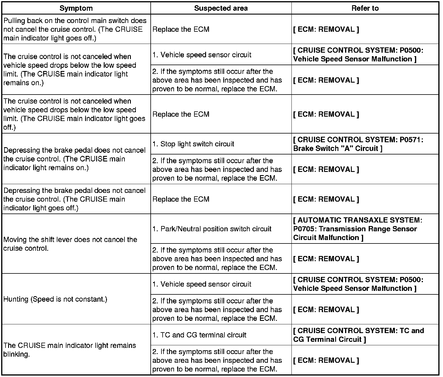 CRUISE CONTROL SYSTEM: PROBLEM SYMPTOMS TABLE