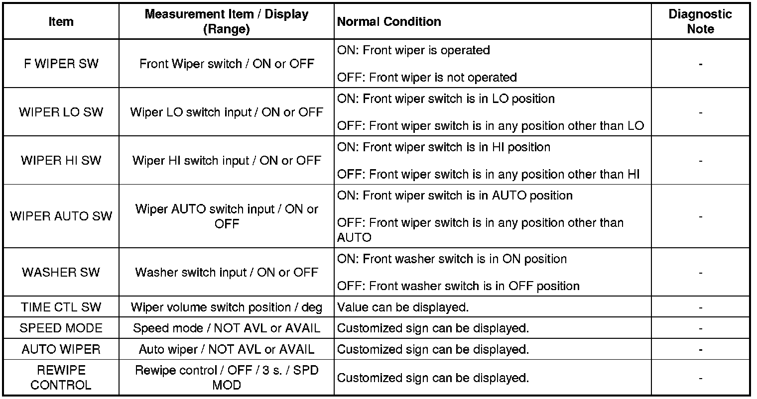 WIPER AND WASHER SYSTEM: DATA LIST / ACTIVE TEST