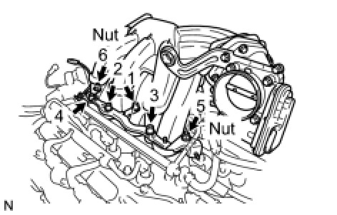 (b) Using a socket hexagon wrench 8 mm, install the intake manifold with the 4 bolts and 2 nuts. Using several steps, tighten the bolts and nuts uniformly in the sequence shown in the illustration.