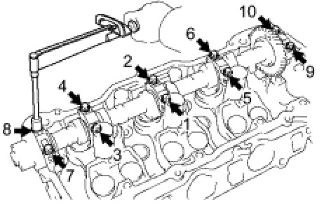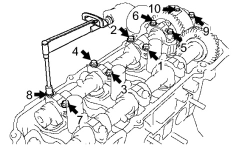 Using several steps, tighten the 10 bearing cap bolts uniformly in the sequence shown in the illustration.
