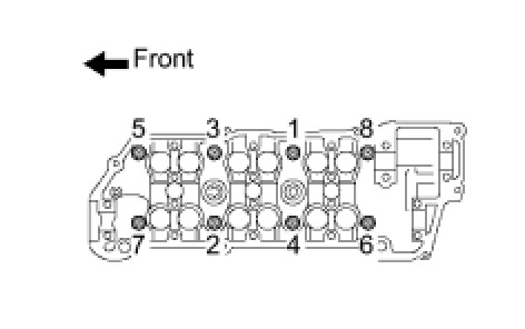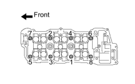 Using several steps, install and tighten the 8 cylinder head bolts uniformly in the sequence shown in the illustration.